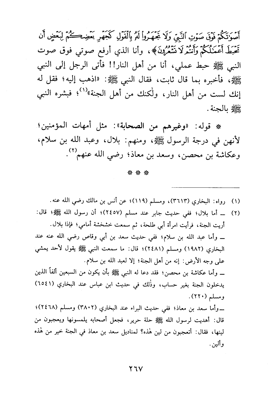 أَصْوَاتَكُمْ فَوْقَ صَوْتِ النَّبِيِّ وَلَا تَجْهَرُوا لَهُ بِالْقَوْلِ كَجَهْرِ بَعْضِكُمْ لِبَعْضٍ أَنْ تَحْبَطَ أَعْمَالُكُمْ وَأَنْتُمْ لَا تَشْعُرُونَ}، وأنا الذي أرفع صوتي فوق صوت النَّبيِّ - صلى الله عليه وسلم - حبط عملي، أنا من أهل النَّار!! فأتى الرجل إلى النَّبيِّ - صلى الله عليه وسلم -، فأخبره بما قال ثابت، فقال النَّبيُّ - صلى الله عليه وسلم -: "اذهب إليه؛ فقل له إنك لست من أهل النَّار، ولكنك من أهل الجنة" (¬1)؛ فبشره النَّبيُّ - صلى الله عليه وسلم - بالجنة.