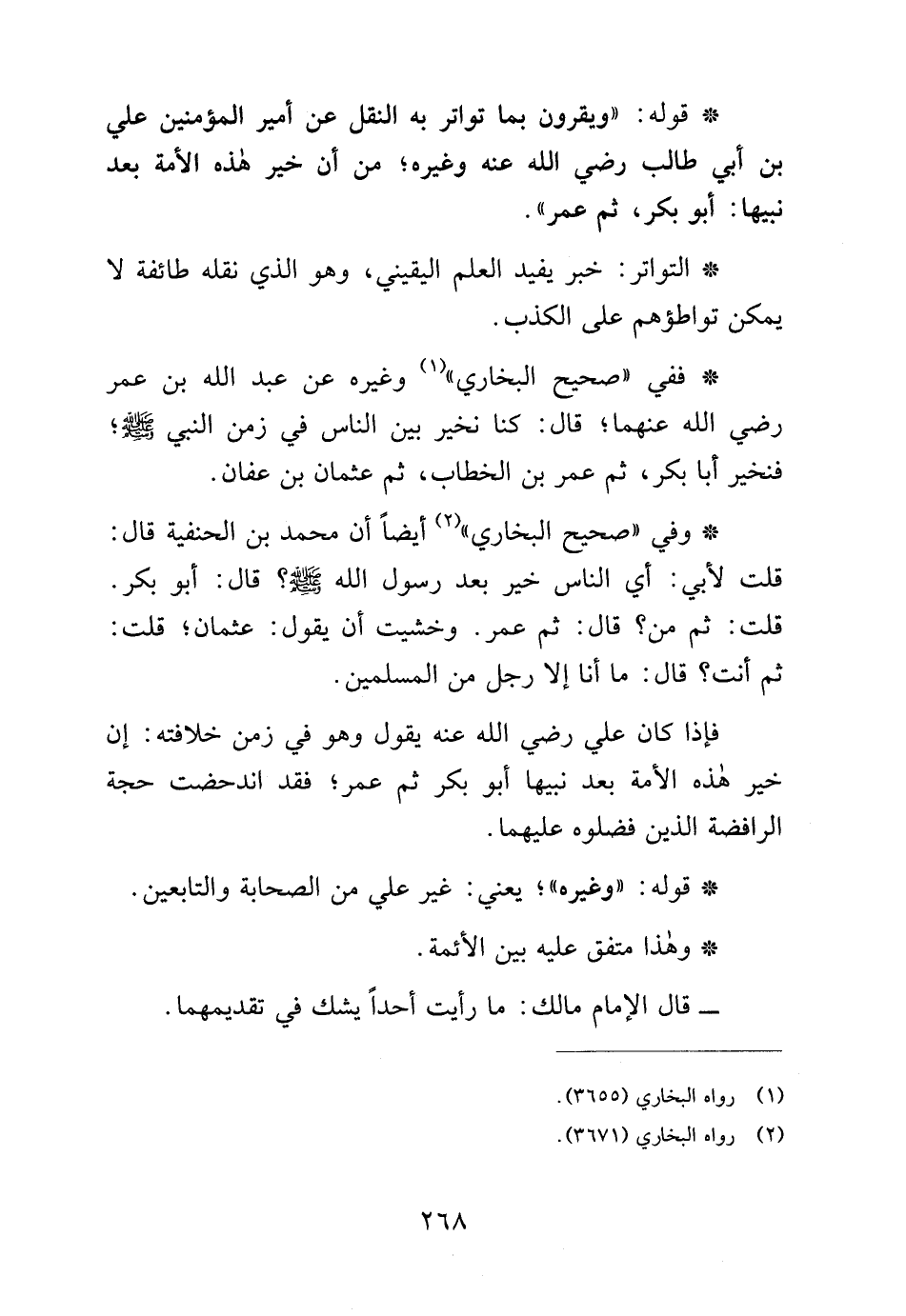 * قوله: "ويقرون بما تواتر به النقل عن أمير المؤمنين علي بن أبي طالب رضي الله عنه وغيره؛ من أن خير هذه الأمة بعد نبيها: أبو بكر، ثم عمر".