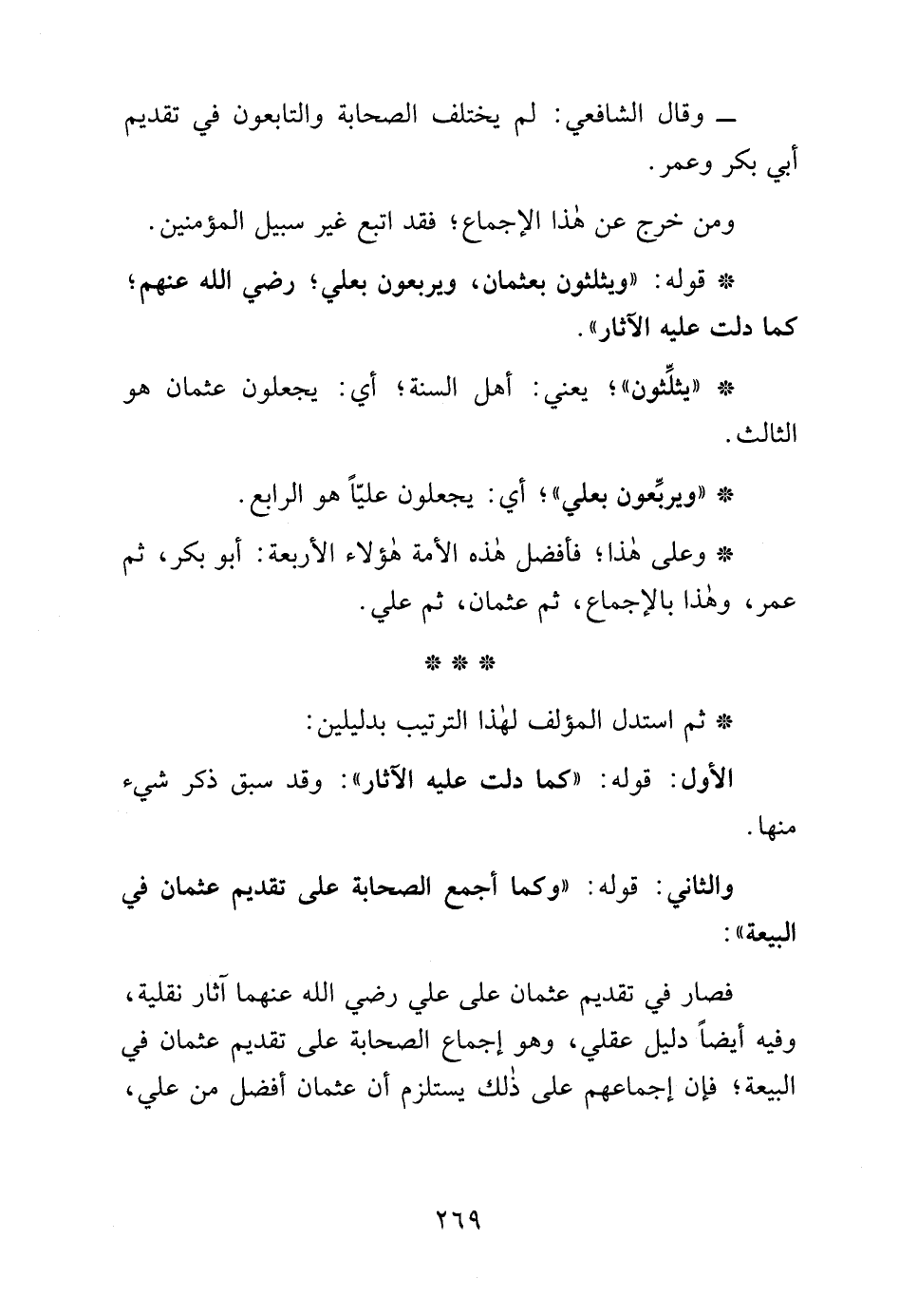 فصار في تقديم عثمان على علي رضي الله عنهما آثار نقلية، وفيه أيضًا دليل عقلي، وهو إجماع الصّحابة على تقديم عثمان في البيعة؛ فإن إجماعهم على ذلك يستلزم أن عثمان أفضل من علي،