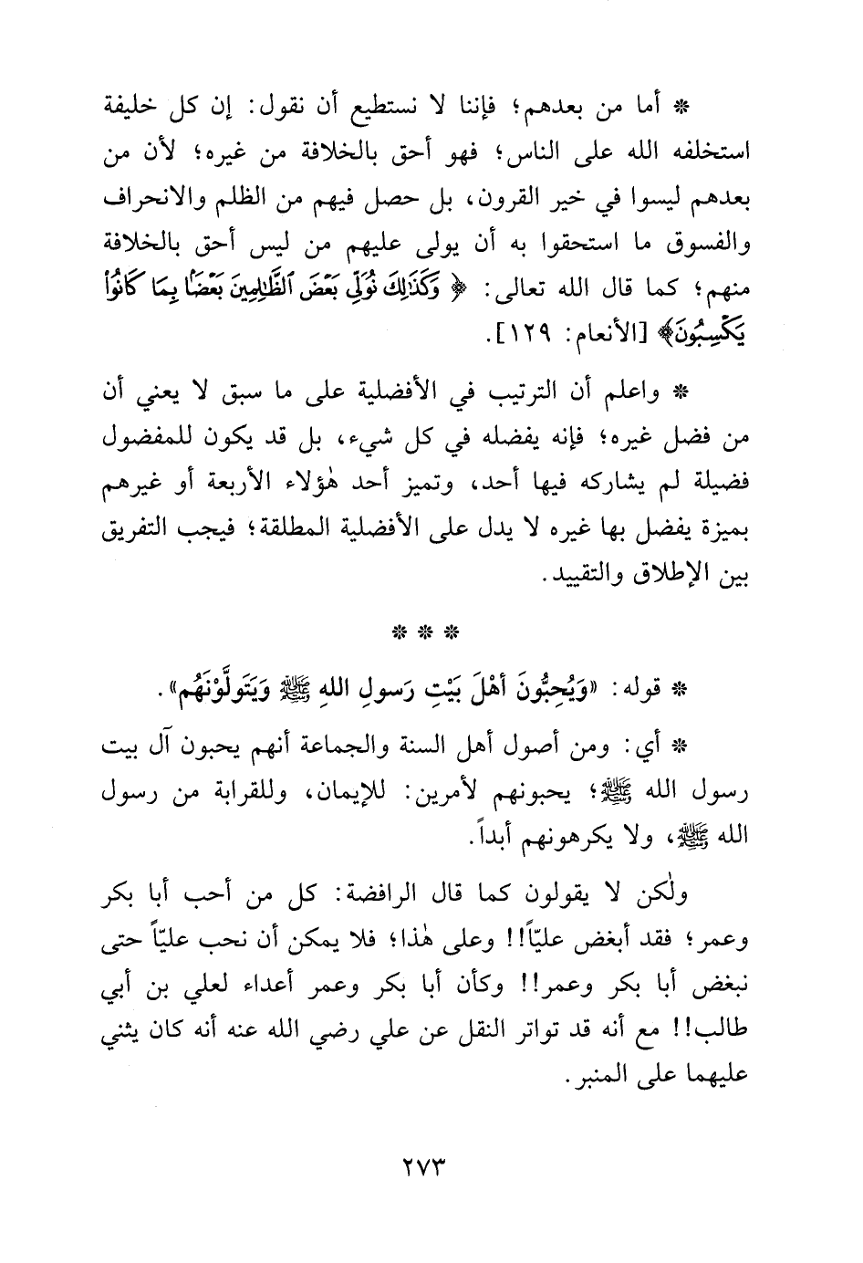 ولكن لا يقولون كما قال الرافضة: كل من أحب أبا بكر وعمر؛ فقد أبغض عليًّا!! وعلى هذا؛ فلا يمكن أن نحب عليًّا حتَّى نبغض أبا بكر وعمر!! وكأن أبا بكر وعمر أعداء لعلي بن أبي طالب!! مع أنَّه قد تواتر النقل عن علي رضي الله عنه أنَّه كان يثني عليهما على المنبر.