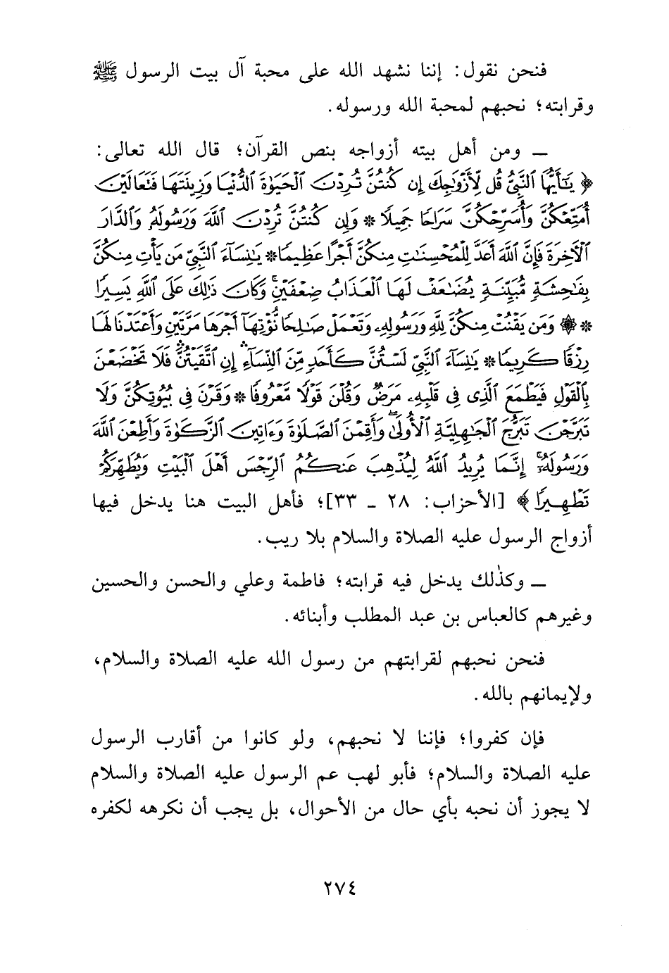 فنحن نقول: إننا نشهد الله على محبة آل بيت الرسول - صلى الله عليه وسلم - وقرابته؛ نحبهم لمحبة الله ورسوله.