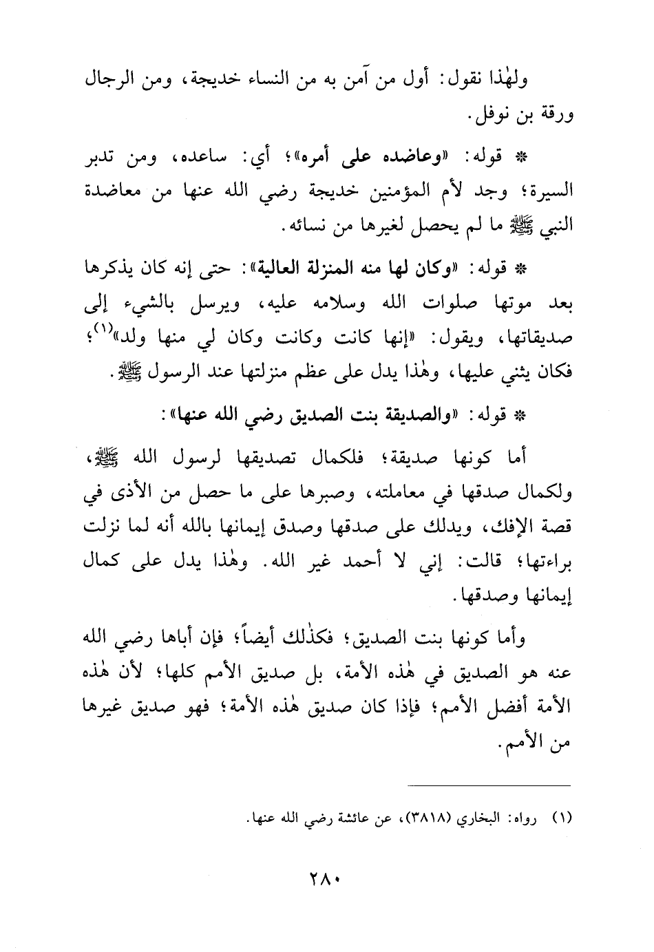 أما كونها صديقة؛ فلكمال تصديقها لرسول الله - صَلَّى الله عليه وسلم -، ولكمال صدقها في معاملته، وصبرها على ما حصل من الأذى في قصة الإفك، ويدلك على صدقها وصدق إيمانها بالله أنَّه لما نزلت براءتها؛ قالت: إنِّي لا أحمد غير الله. وهذا يدل على كمال إيمانها وصدقها.
