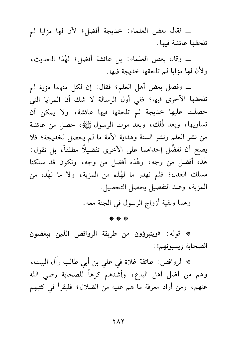 - وفصل بعض أهل العلم؛ فقال: إن لكل منهما مزية لم تلحقها الأخرى فيها؛ ففي أول الرسالة لا شك أن المزايا التي حصلت عليها خديجة لم تلحقها فيها عائشة، ولا يمكن أن تساويها، وبعد ذلك، وبعد موت الرسول - صَلَّى الله عليه وسلم -، حصل من عائشة من نشر العلم ونشر السنة وهداية الأمة ما لم يحصل لخديجة؛ فلا يصح أن تفضَّل إحداهما على الأخرى تفضيلًا مطلقًا، بل نقول: هذه أفضل من وجه، وهذه أفضل من وجه، ونكون قد سلكنا مسلك العدل؛ فلم نهدر ما لهذه من المزية، ولا ما لهذه من المزية، وعند التفصيل يحصل التحصيل.