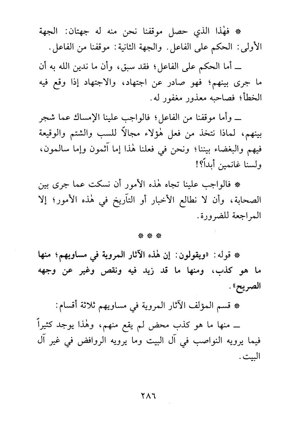- وأمَّا موقفنا من الفاعل؛ فالواجب علينا الإمساك عما شجر بينهم، لماذا نتخذ من فعل هؤلاء مجالًا للسب والشتم والوقيعة فيهم والبغضاء بيننا؛ ونحن في فعلنا هذا إما آثمون وإما سالمون، ولسنا غانمين أبدًا؟!