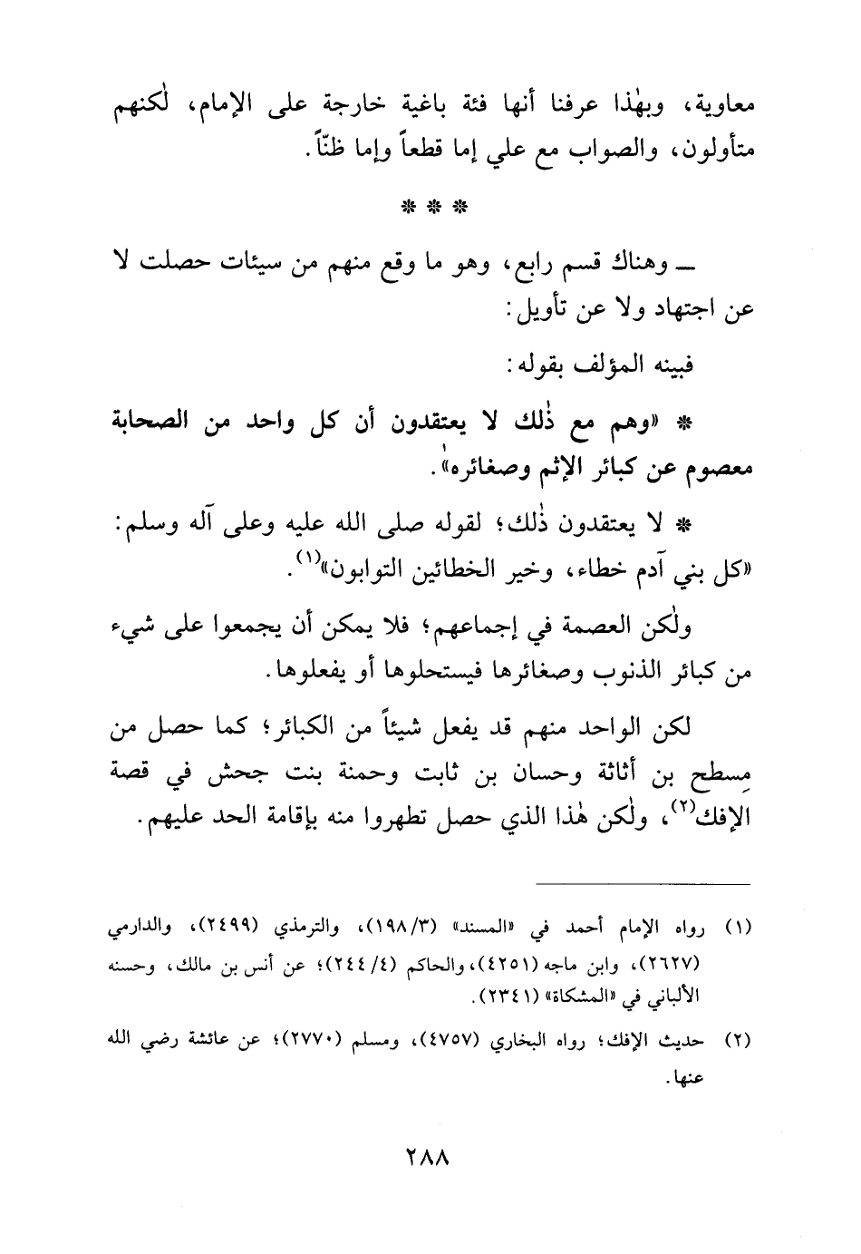 * "وهم مع ذلك لا يعتقدون أن كل واحد من الصّحابة معصوم عن كبائر الإثم وصغائره".