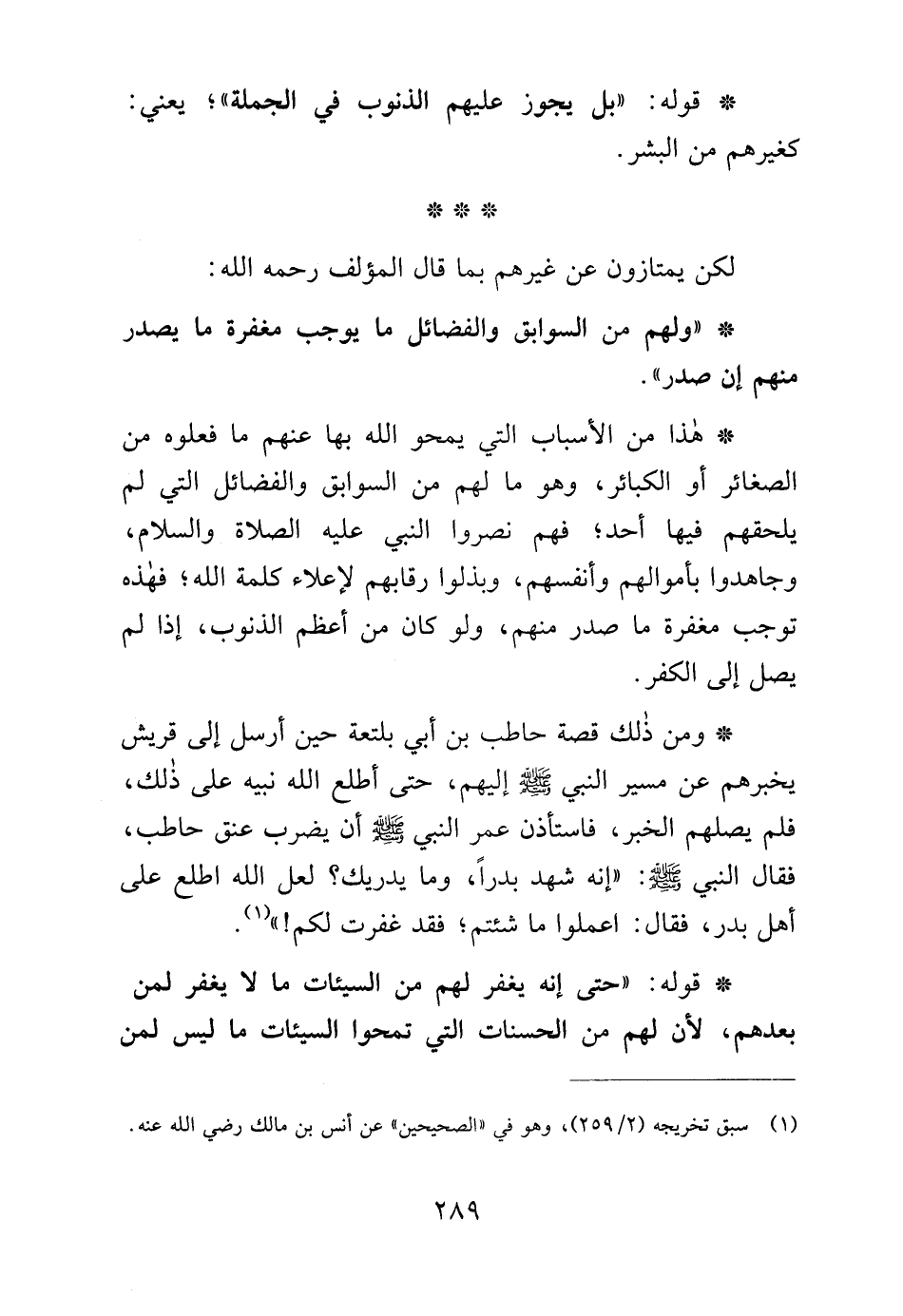 * "ولهم من السوابق والفضائل ما يوجب مغفرة ما يصدر منهم إن صدر".