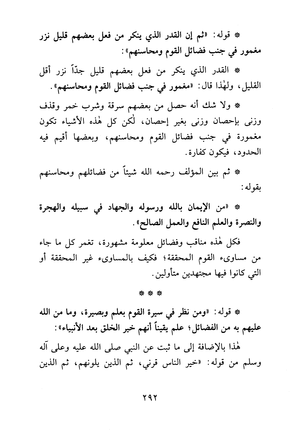 * ولا شك أنَّه حصل من بعضهم سرقة وشرب خمر وقذف وزنى بإحصان وزنى بغير إحصان، لكن كل هذه الأشياء تكون مغمورة في جنب فضائل القوم ومحاسنهم، وبعضها أقيم فيه الحدود، فيكون كفارة.