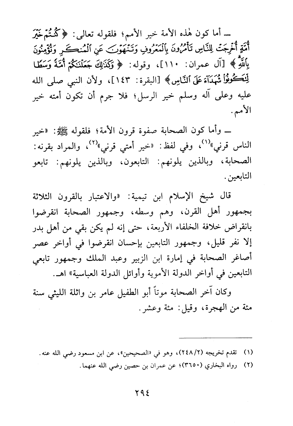 قال شيخ الإسلام ابن تيمية: "والاعتبار بالقرون الثلاثة بجمهور أهل القرن، وهم وسطه، وجمهور الصّحابة انقرضوا بانقراض خلافة الخلفاء الأربعة، حتَّى إنه لم يكن بقي من أهل بدر إلَّا نفر قليل، وجمهور التّابعين بإحسان انقرضوا في أواخر عصر أصاغر الصّحابة في إمارة ابن الزُّبير وعبد الملك وجمهور تابعي التّابعين في أواخر الدولة الأموية وأوائل الدولة العباسية" اهـ.