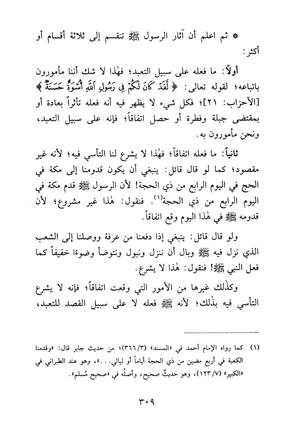 * ثم اعلم أن آثار الرسول - صلى الله عليه وسلم - تنقسم إلى ثلاثة أقسام أو أكثر: