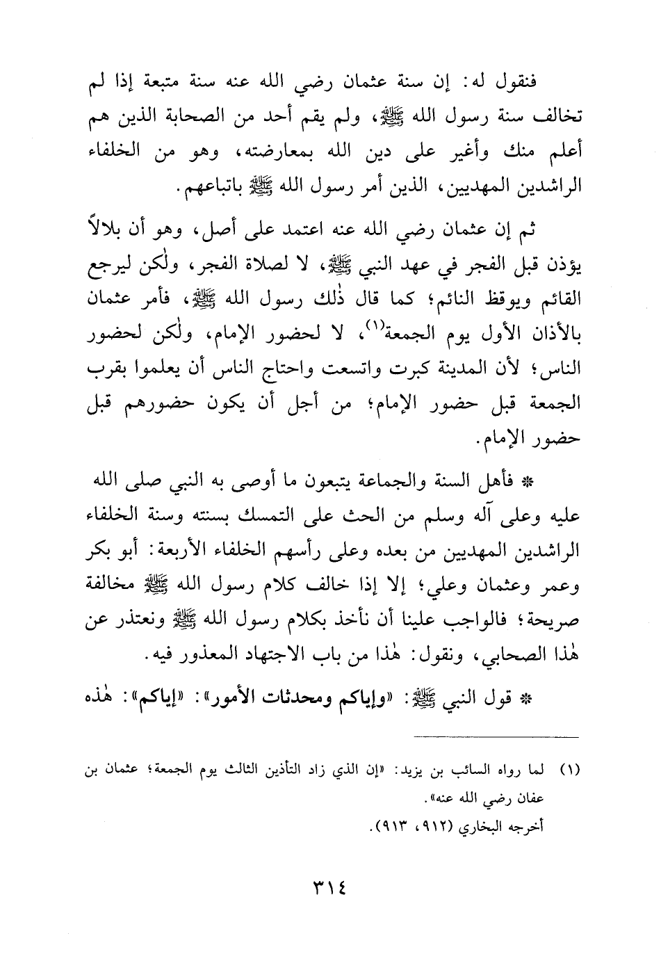 فنقول له: إن سنة عثمان رضي الله عنه سنة متبعة إذا لم تخالف سنة رسول الله - صلى الله عليه وسلم -، ولم يقم أحد من الصحابة الذين هم أعلم منك وأغير على دين الله بمعارضته، وهو من الخلفاء الراشدين المهديين، الذين أمر رسول الله - صلى الله عليه وسلم - باتباعهم.