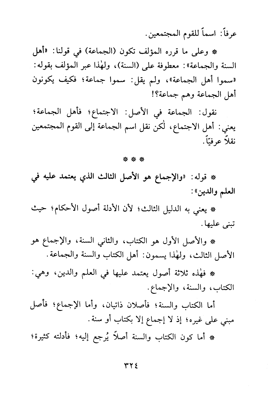 * والأصل الأول هو الكتاب، والثاني السنة، والإجماع هو الأصل الثالث، ولهذا يسمون: أهل الكتاب والسنة والجماعة.