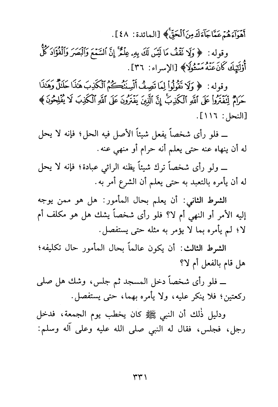 - ولو رأى شخصًا ترك شيئًا يظنه الرائي عبادة؛ فإنه لا يحل له أن يأمره بالتعبد به حتَّى يعلم أن الشرع أمر به.
