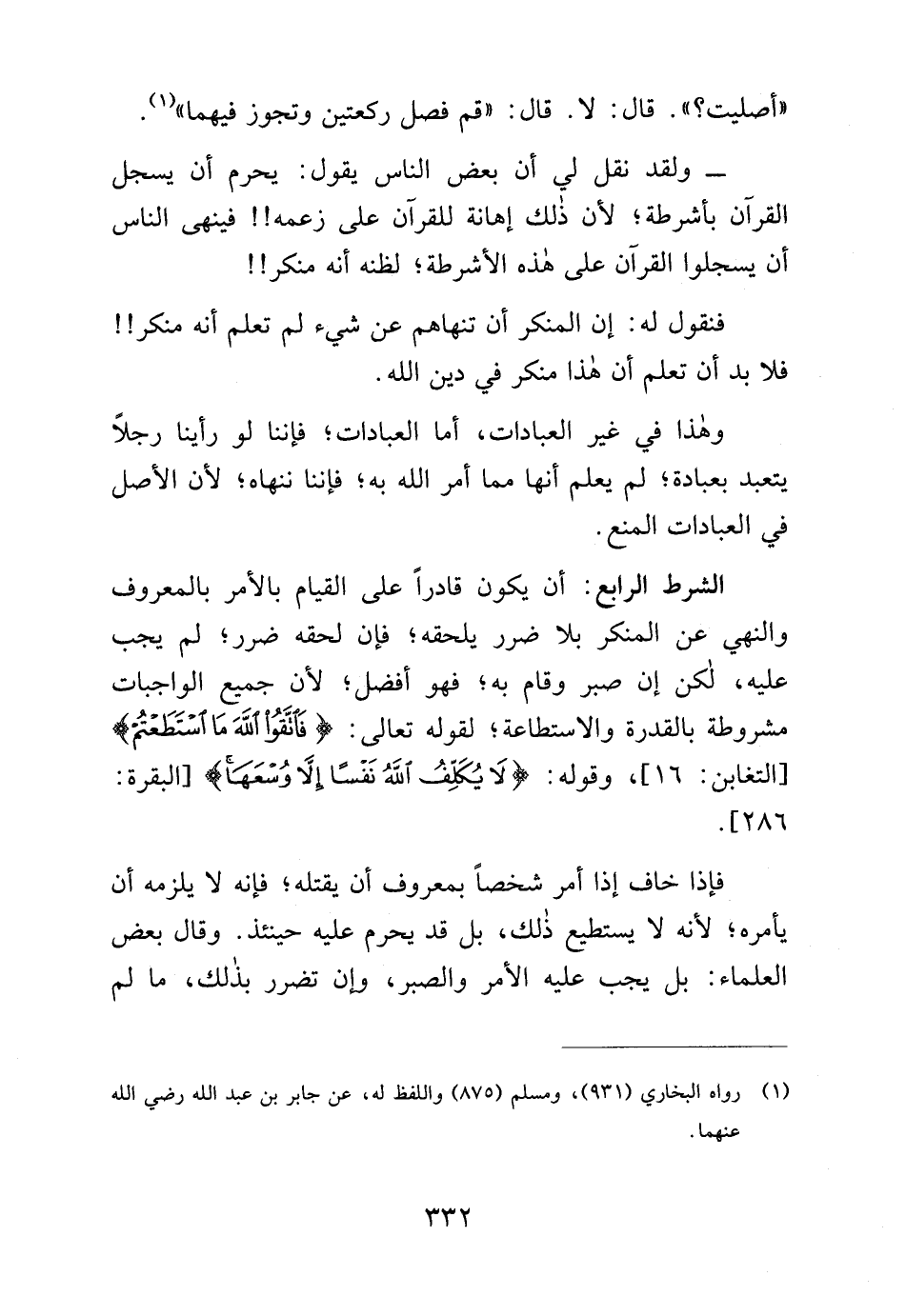 الشرط الرابع: أن يكون قادرًا على القيام بالأمر بالمعروف والنهي عن المنكر بلا ضرر يلحقه؛ فإن لحقه ضرر؛ لم يجب عليه، لكن إن صبر وقام به؛ فهو أفضل؛ لأن جميع الواجبات مشروطة بالقدرة والاستطاعة؛ لقوله تعالى: {فَاتَّقُوا اللَّهَ مَا اسْتَطَعْتُمْ} [التغابن: 16]، وقوله: {لَا يُكَلِّفُ اللَّهُ نَفْسًا إلا وُسْعَهَا} [البقرة: 286].