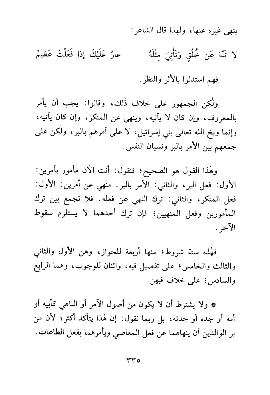 * ولا يشترط أن لا يكون من أصول الآمر أو الناهي كأبيه أو أمه أو جده أو جدته، بل ربما نقول: إن هذا يتأكد أكثر؛ لأن من بر الوالدين أن ينهاهما عن فعل المعاصي ويأمرهما بفعل الطاعات.