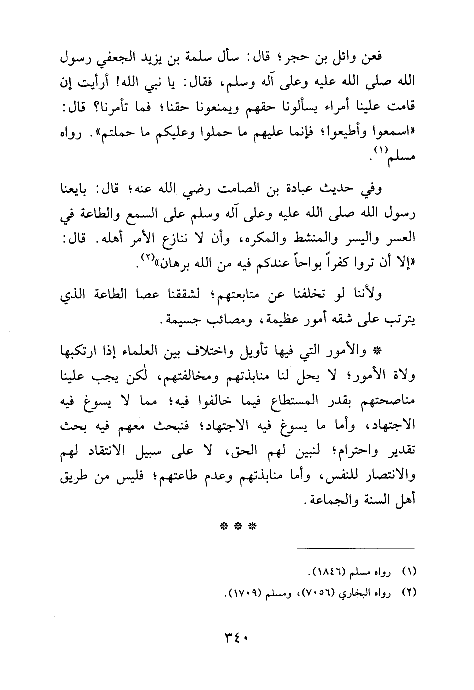 * والأمور التي فيها تأويل واختلاف بين العلماء إذا ارتكبها ولاة الأمور؛ لا يحل لنا منابذتهم ومخالفتهم، لكن يجب علينا مناصحتهم بقدر المستطاع فيما خالفوا فيه؛ مما لا يسوغ فيه الاجتهاد، وأما ما يسوغ فيه الاجتهاد؛ فنبحث معهم فيه بحث تقدير واحترام؛ لنبين لهم الحق، لا على سبيل الانتقاد لهم والانتصار للنفس، وأما منابذتهم وعدم طاعتهم؛ فليس من طريق أهل السنة والجماعة.