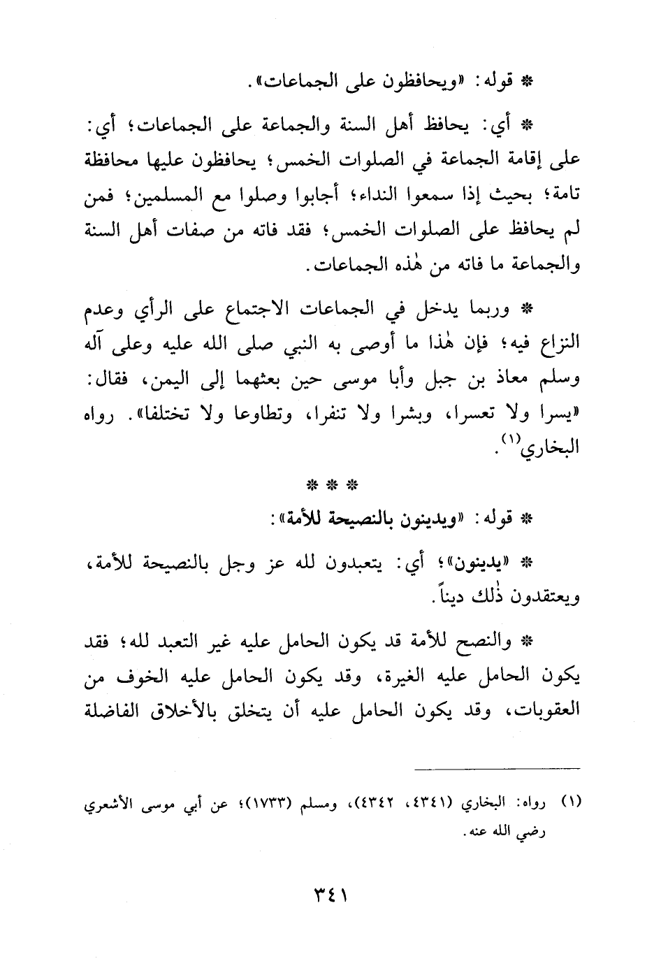 * وربما يدخل في الجماعات الاجتماع على الرأي وعدم النزاع فيه، فإن هذا ما أوصى به النبي صلى الله عليه وعلى آله وسلم معاذ بن جبل وأبا موسى حين بعثهما إلى اليمن، فقال: "يسرا ولا تعسرا، وبشرا ولا تنفرا، وتطاوعا ولا تختلفا". رواه البخاري (¬1).