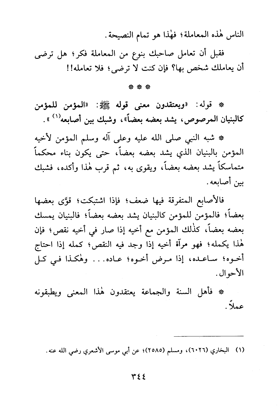 * قوله: "ويعتقدون معنى قوله - صلى الله عليه وسلم -: "المؤمن للمؤمن كالبنيان المرصوص، يشد بعضه بعضًا"، وشبك بين أصابعه (¬1) ".