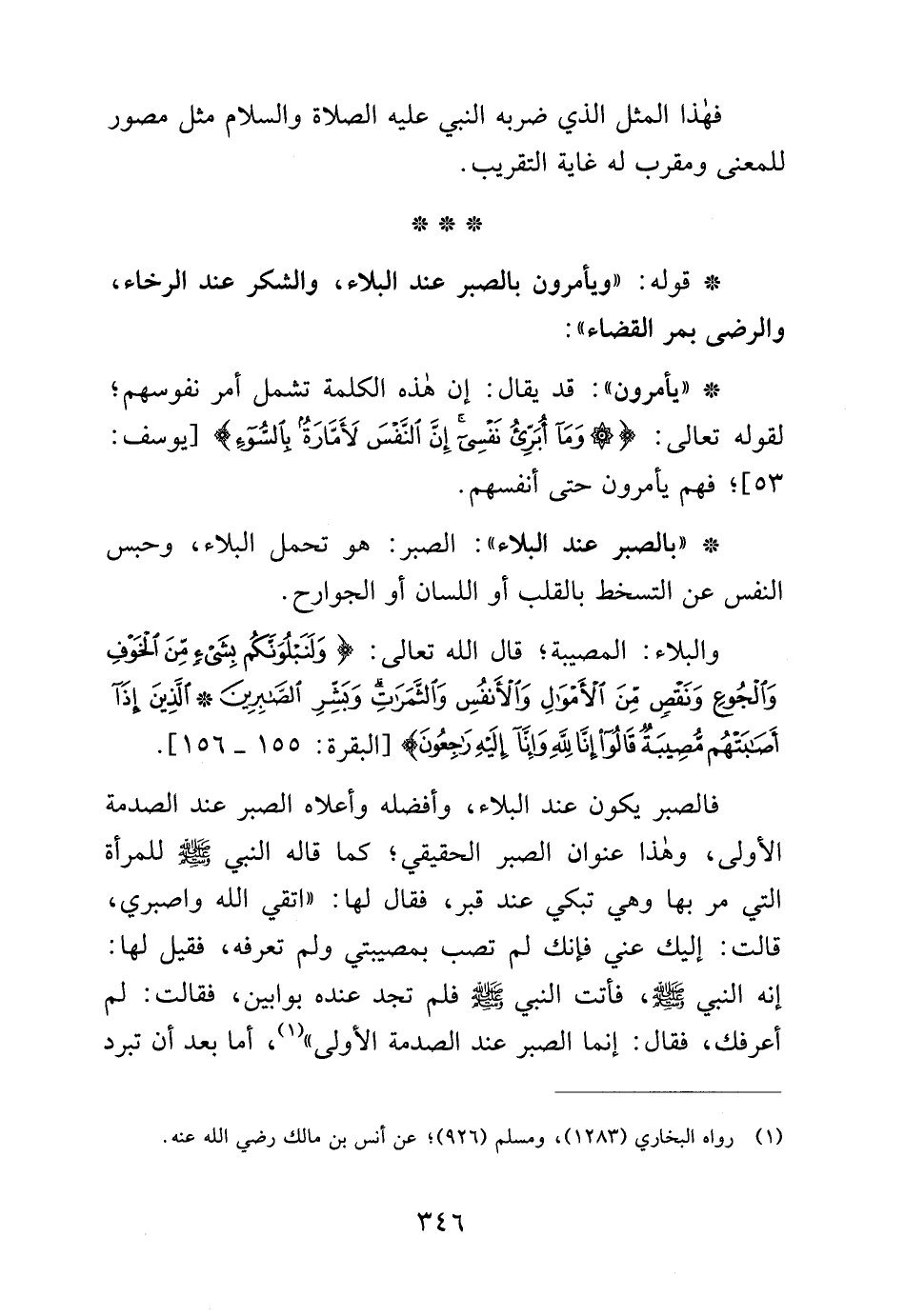 * قوله: "ويأمرون بالصبر عند البلاء، والشكر عند الرخاء، والرضى بمر القضاء":