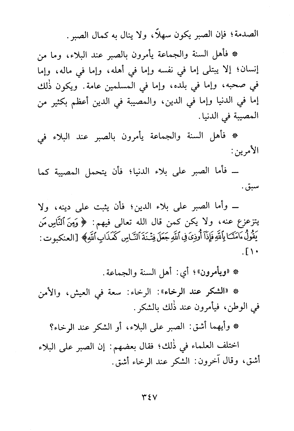 * فأهل السنة والجماعة يأمرون بالصبر عند البلاء، وما من إنسان؛ إلا يبتلى إما في نفسه وإما في أهله، وإما في ماله، وإما في صحبه، وإما في بلده، وإما في المسلمين عامة. ويكون ذلك إما في الدنيا وإما في الدين، والمصيبة في الدين أعظم بكثير من المصيبة في الدنيا.