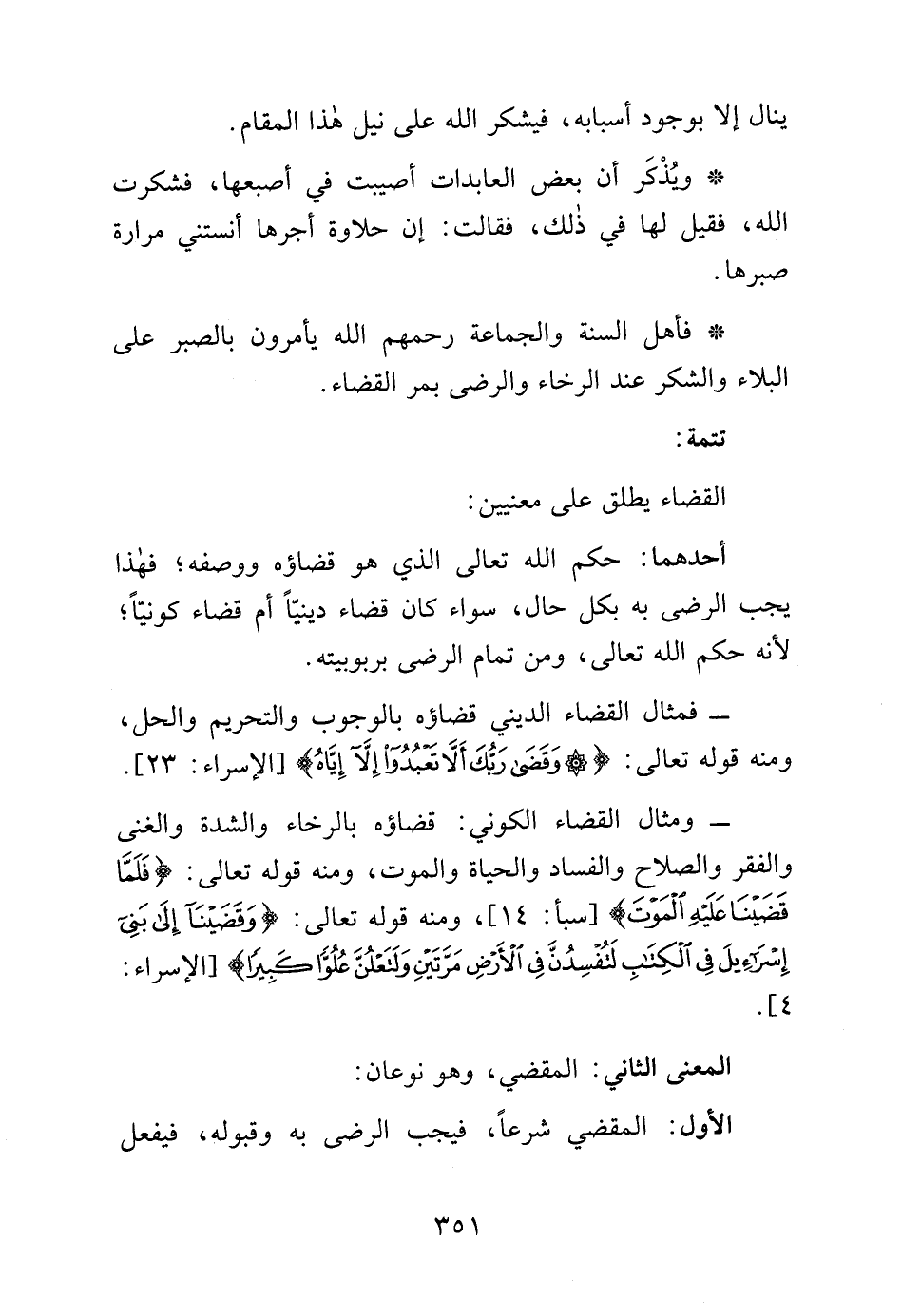 * فأهل السنة والجماعة رحمهم الله يأمرون بالصبر على البلاء والشكر عند الرخاء والرضى بمر القضاء.