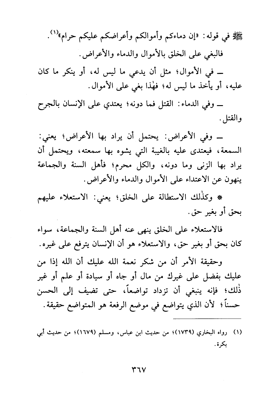 - وفي الأعراض: يحتمل أن يراد بها الأعراض؛ يعني: السمعة، فيعتدى عليه بالغيبة التي يشوه بها سمعته، ويحتمل أن يراد بها الزنى وما دونه، والكل محرم؛ فأهل السنة والجماعة ينهون عن الاعتداء على الأموال والدماء والأعراض.