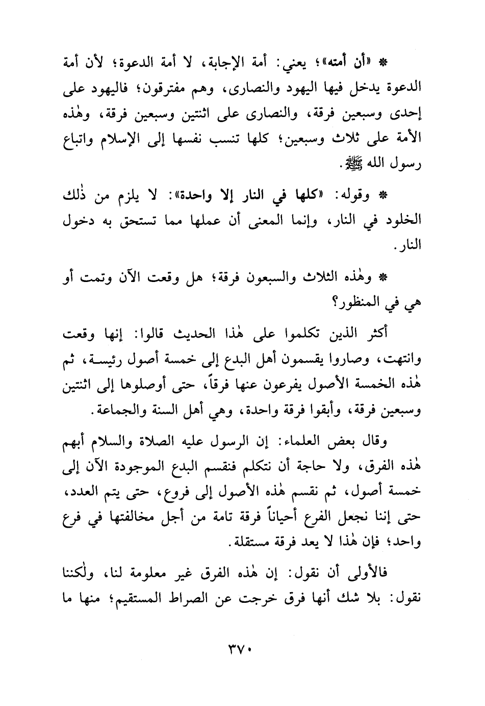 وقال بعض العلماء: إن الرسول عليه الصلاة والسلام أبهم هذه الفرق، ولا حاجة أن نتكلم فنقسم البدع الموجودة الآن إلى خمسة أصول، ثم نقسم هذه الأصول إلى فروع، حتى يتم العدد، حتى إننا نجعل الفرع أحيانًا فرقة تامة من أجل مخالفتها في فرع واحد؛ فإن هذا لا يعد فرقة مستقلة.