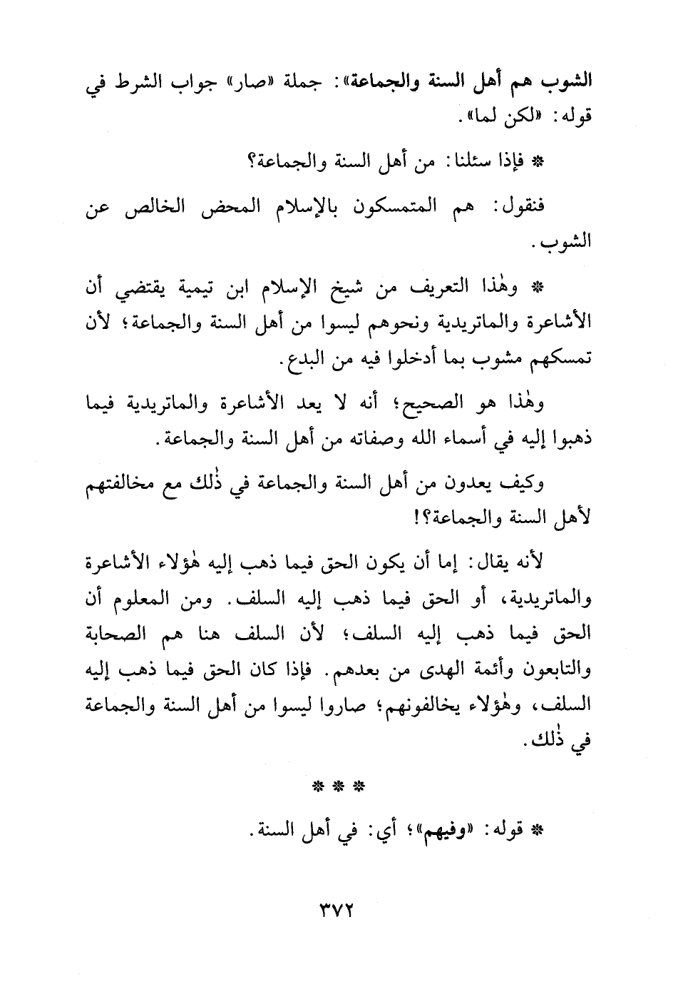 * وهذا التعريف من شيخ الإسلام ابن تيمية يقتضي أن الأشاعرة والماتريدية ونحوهم ليسوا من أهل السنة والجماعة؛ لأن تمسكهم مشوب بما أدخلوا فيه من البدع.