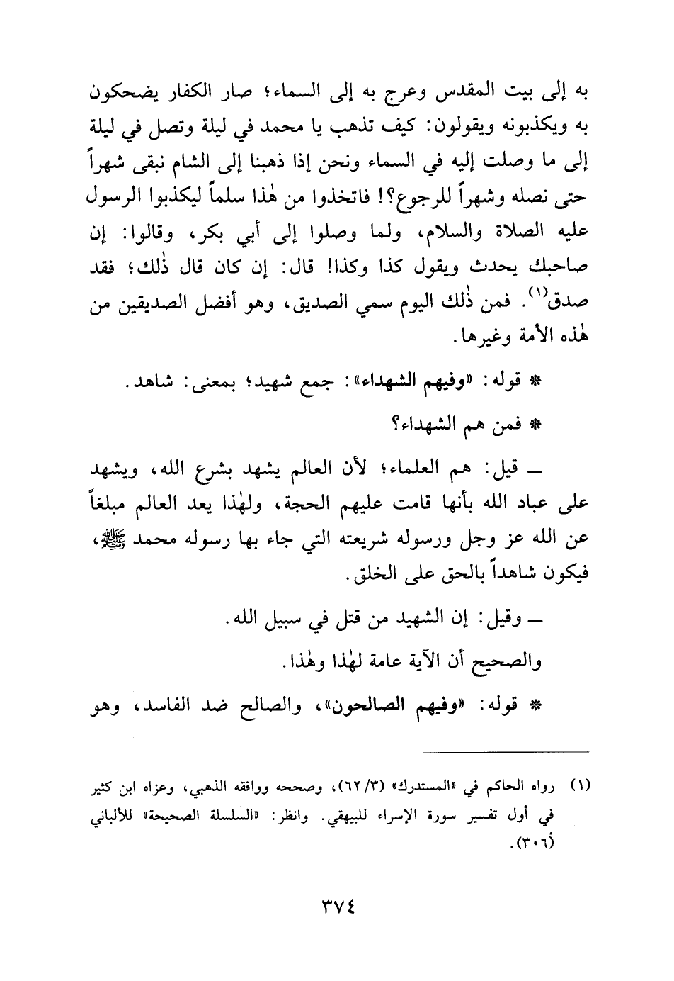 به إلى بيت المقدس وعرج به إلى السماء؛ صار الكفار يضحكون به ويكذبونه ويقولون: كيف تذهب يا محمد في ليلة وتصل في ليلة إلى ما وصلت إليه في السماء ونحن إذا ذهبنا إلى الشام نبقى شهرًا حتى نصله وشهرًا للرجوع؟! فاتخذوا من هذا سلمًا ليكذبوا الرسول عليه الصلاة والسلام، ولما وصلوا إلى أبي بكر، وقالوا: إن صاحبك يحدث ويقول كذا وكذا! قال: إن كان قال ذلك؛ فقد صدق (¬1). فمن ذلك اليوم سمي الصديق، وهو أفضل الصديقين من هذه الأمة وغيرها.