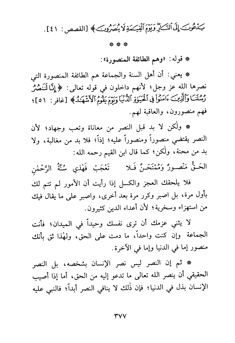 * يعني: أن أهل السنة والجماعة هم الطائفة المنصورة التي نصرها الله عزَّ وجلَّ؛ لأنهم داخلون في قوله تعالى: {إِنَّا لَنَنْصُرُ رُسُلَنَا وَالَّذِينَ آمَنُوا فِي الْحَيَاةِ الدُّنْيَا وَيَوْمَ يَقُومُ الْأَشْهَادُ} [غافر: 51]؛ فهم منصورون، والعاقبة لهم.