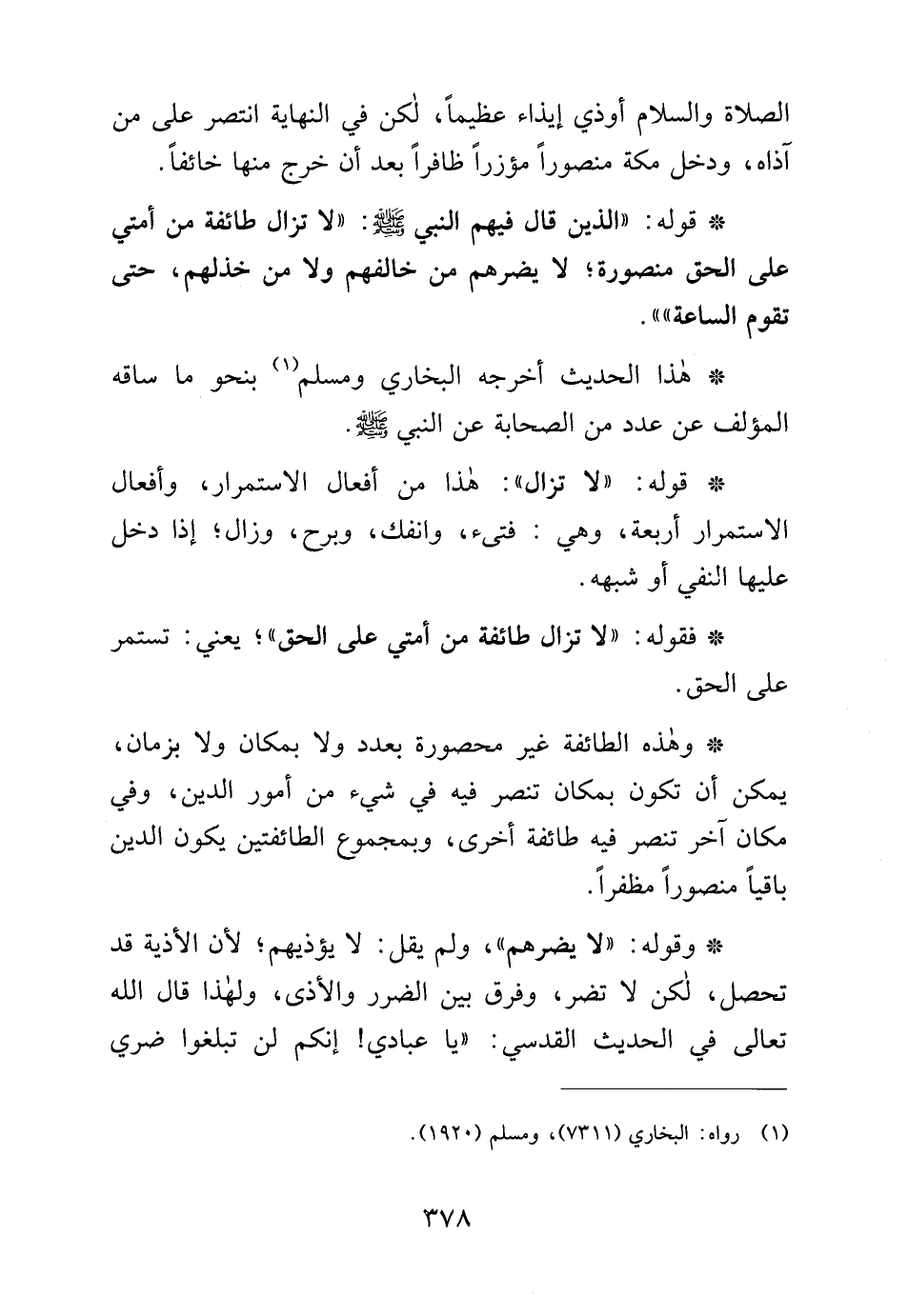 * وهذه الطائفة غير محصورة بعدد ولا بمكان ولا بزمان، يمكن أن تكون بمكان تنصر فيه في شيء من أمور الدين، وفي مكان آخر تنصر فيه طائفة أخرى، وبمجموع الطائفتين يكون الدين باقيًا منصورًا مظفرًا.