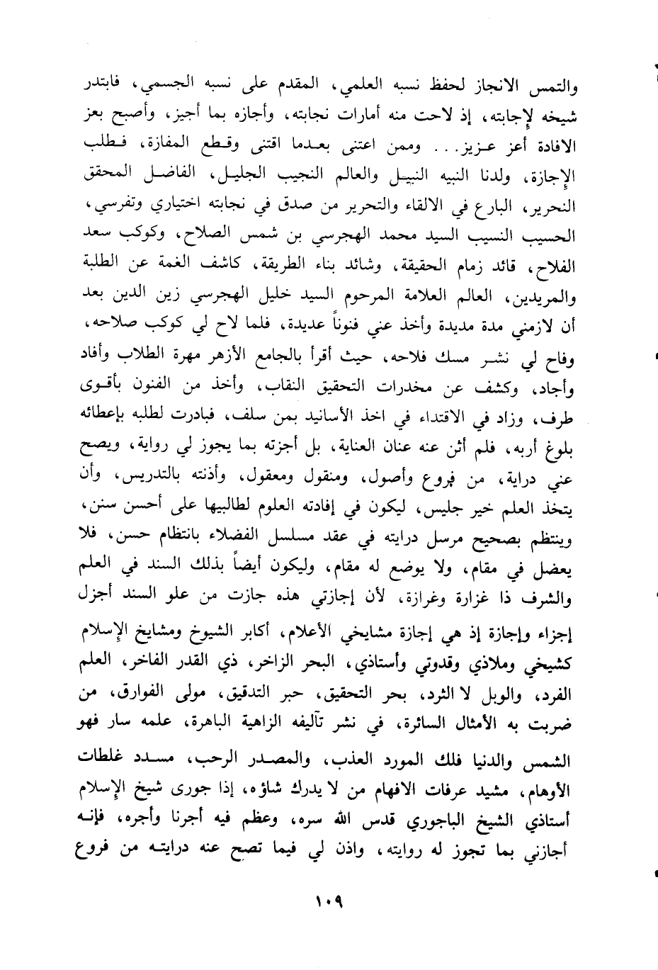 والتمس الانجاز لحفظ نسبه العلمي، المقدم على نسبه الجسمي، فابتدر شيخه لإجابته، إذ لاحت منه أمارات نجابته، وأجازه بما أجيز، وأصبح بعز الافادة أعز عزيز. . . وممن اعتنى بعد ما اقتنى وقطع المفازة، فطلب الإجازة، ولدنا النبيه النبيل والعالم النجيب الجليل، الفاضل المحقق النحرير، البارع في الالقاء والتحرير من صدق في نجابته اختياري وتفرسي، الحسيب النسيب السيد محمد الهجرسي بن شمس الصلاح، وكوكب سعد الفلاح، قائد زمام الحقيقة، وشائد بناء الطريقة، كاشف الغمة عن الطلبة والمريدين، العالم العلامة المرحوم السيد خليل الهجرسي زين الدين بعد أن لازمني مدة مديدة وأخذ عني فنونا عديدة، فلما لاح لي كوكب صلاحه، وفاح لي نشر مسك فلاحه، حيث أقرأ بالجامع الأزهر مهرة الطلاب وأفاد وأجاد، وكشف عن مخدرات التحقيق النقاب، وأخذ من الفنون بأقوى طرف، وزاد في الاقتداء في اخذ الأسانيد بمن سلف، فبادرت لطلبه بإعطائه بلوغ أربه، فلم أثن عنه عنان العناية، بل أجزته بما يجوز لي رواية، ويصح عني دراية، من فروع وأصول، ومنقول ومعقول، وأذنته بالتدريس، وأن يتخذ العلم خير جليس، ليكون في إفادته العلوم لطالبيها على أحسن سنن، وينتظم بصحيح مرسل درايته في عقد مسلسل الفضلاء بانتظام حسن، فلا يعضل في مقام، ولا يوضع له مقام، وليكون أيضا بذلك السند في العلم والشرف ذا غزارة وغرازة، لأن إجازتي هذه جازت من علو السند أجزل إجزاء وإجازة إذ هي إجازة مشايخي الأعلام، أكابر الشيوخ ومشايخ الإسلام كشيخي وملاذي وقدوتي وأستاذي، البحر الزاخر، ذي القدر الفاخر، العلم الفرد، والوبل لا الثرد، بحر التحقيق، حبر التدقيق، مولى الفوارق، من ضربت به الأمثال السائرة، في نشر تآليفه الزاهية الباهرة، علمه سار فهو الشمس والدنيا فلك المورد العذب، والمصدر الرحب، مسدد غلطات الأوهام، مشيد عرفات الافهام من لا يدرك شاؤه، إذا جورى شيخ الإسلام أستاذي الشيخ الباجوري قدس اللّه سره، وعظم فيه أجرنا وأجره، فإنه أجازني بما تجوز له روايته، واذن لي فيما تصح عنه درايته من فروع