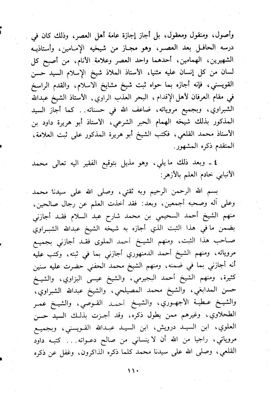 بسم اللّه الرحمن الرحيم وبه ثقتي، وصلى اللّه على سيدنا محمد وعلى آله وصحبه أجمعين، وبعد: فقد أخذت العلم عن رجال صالحين، منهم الشيخ أحمد السحيمي بن محمد شارح عبد السلام فقد أجازني بضمن ما في هذا الثبت الذي أجازه به شيخه الشيخ عبد اللّه الشبراوي صاحب هذا الثبت، ومنهم الشيخ أحمد الملوى فقد أجازني بجميع مروياته، ومنهم الشيخ أحمد الدمنهوري أجازني بما في ثبته، وكتب عليه أنه أجازني بما في ضمنه، ومنهم الشيخ محمد الحفني حضرت عليه سنين كثيرة، ومنهم الشيخ أحمد البجيرمي، والشيخ عيسى البزاوي، والشيخ حسن المدابغي، والشيخ محمد المصيلحي، والشيخ عبد اللّه الشبراوي، والشيخ عطية الأجهوري، والشيخ أحمد القوصي، والشيخ عمر الطحلاوي، وغيرهم ممن يطول ذكره، وقد أجزت بذلك السيد حسن العلوي، ابن السيد درويش، ابن السيد عبد اللّه القويسني، وبجميع مروياتي، راجيا من اللّه أن لا ينساني من صالح دعواته. . . كتبه داود القلعي، وصلى اللّه على سيدنا محمد كلما ذكره الذاكرون، وغفل عن ذكره