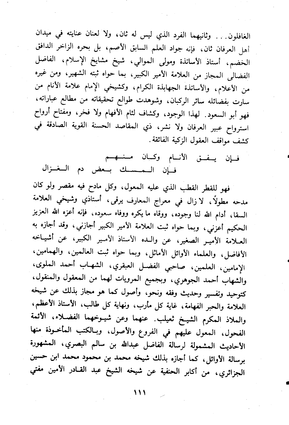 فهو للقطر القطب الذي عليه المعول، وكل مادح فيه مقصر ولو كان مدحه مطولا، لا زال في معراج المعارف يرقى، أستاذي وشيخي العلامة السقا، أدام اللّه لنا وجوده، ووقاه ما يكره ووفاه سعوده، فإنه أعزه اللّه العزيز الحكيم أعزني، وبما حواه ثبت العلامة الأمير الكبير أجازني، وقد أجازه به العلامة الأمير الصغير، عن والده الأستاذ الأمير الكبير، عن أشياخه الأفاضل، والعلماء الأوائل الأماثل، وبما حواه ثبت العالمين، والهمامين، الإمامين، العلمين، صاحبي الفضل العبقري، الشهاب أحمد الملوى، والشهاب أحمد الجوهري، وبجميع المرويات لهما من المعقول والمنقول، كتوحيد وتفسير وحديث وفقه ونحو، وأصول كما هو مجاز بذلك عن شيخه العلامة والحبر الفهامة، غاية كل مأرب، ونهاية كل طالب، الأستاذ الأعظم، والملاذ المكرم الشيخ ثعيلب. عنهما وعن شيوخهما الفضلاء، الأئمة الفحول، المعول عليهم في الفروع والأصول، وبالكتب المأخوذة منها الأحاديث المشمولة لرسالة الفاضل عبد اللّه بن سالم البصري، المشهورة برسالة الأوائل، كما أجازه بذلك شيخه محمد بن محمود محمد ابن حسين الجزائري، من أكابر الحنفية عن شيخه الشيخ عبد القادر الأمين مفتي