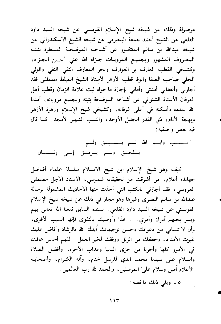 كيف وهو شيخ الإسلام ابن شيخ الاسلام سلسلة علماء أفاضل جهابذة أعلام، من أشرقت من تحقيقاته شموسي، الأستاذ الأجل مصطفى العروسي، فقد أجازني بالكتب التي أخذت منها الأحاديث المشمولة برسالة عبد اللّه بن سالم البصري وغيرها وهو مجاز في ذلك عن شيخه شيخ الإسلام القويسني عن شيخه السيد داود القلعي. بسنده السابق نفعنا اللّه تعالى بهم ويسر بحبهم أمرك وأمري. . . هذا وأوصيك بالتقوى فإنها السبب الأقوى، وأن لا تنساني من دعواتك وحسن توجيهاتك أيدك اللّه بالرشاد وأفاض عليك غيوث الأمداد، وحفظك من الزلل ووفقك لخير العمل. اللهم أحسن عاقبتنا في الأمور كلها وأجرنا من خزي الدنيا وعذاب الآخرة، وأفضل الصلاة والسلام على سيدنا محمد الذي للرسل ختام، وآله الكرام، وأصحابه الأعلام آمين وسلام على المرسلين، والحمد للّه رب العالمين.