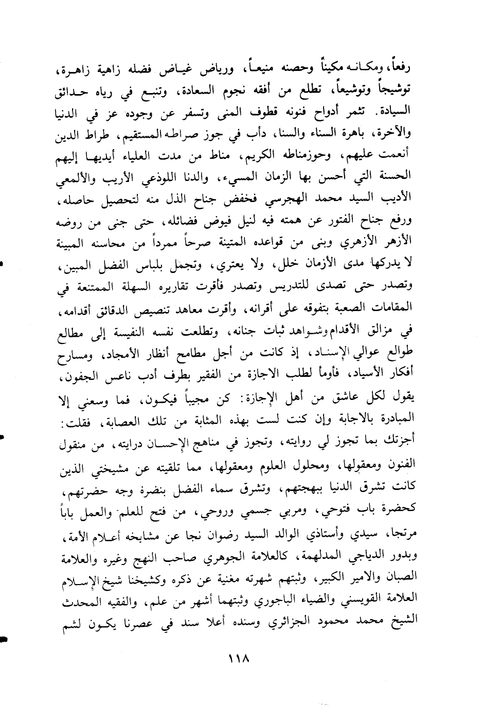 رفعا، ومكانه مكينا وحصنه منيعا، ورياض غياض فضله زاهية زاهرة، توشيجا وتوشيعا، تطلع من أفقه نجوم السعادة، وتنبع في رياه حدائق السيادة. تثمر أدواح فنونه قطوف المنى وتسفر عن وجوده عز في الدنيا والآخرة، باهرة السناء والسنا، دأب في جوز صراطه المستقيم، صراط الدين أنعمت عليهم، وحوز مناطه الكريم، مناط من مدت العلياء أيديها إليهم الحسنة التي أحسن بها الزمان المسيء، والدنا اللوذعي الأريب والألمعي الأديب السيد محمد الهجرسي فخفض جناح الذل منه لتحصيل حاصله، ورفع جناح الفتور عن همته فيه لنيل فيوض فضائله، حتى جنى من روضه الأزهر الأزهري وبنى من قواعده المتينة صرحا ممردا من محاسنه المبينة لا يدركها مدى الأزمان خلل، ولا يعتري، وتجمل بلباس الفضل المبين، وتصدر حتى تصدى للتدريس وتصدر فأقرت تقاريره السهلة الممتنعة في المقامات الصعبة بتفوقه على أقرانه، وأقرت معاهد تنصيص الدقائق أقدامه، في مزالق الأقدام وشواهد ثبات جنانه، وتطلعت نفسه النفيسة إلى مطالع طوالع عوالي الإسناد، إذ كانت من أجل مطامح أنظار الأمجاد، ومسارح أفكار الأسياد، فأومأ لطلب الاجازة من الفقير بطرف أدب ناعس الجفون، يقول لكل عاشق من أهل الإجازة: كن مجيبا فيكون، فما وسعني إلا المبادرة بالاجابة وإن كنت لست بهذه المثابة من تلك العصابة، فقلت: