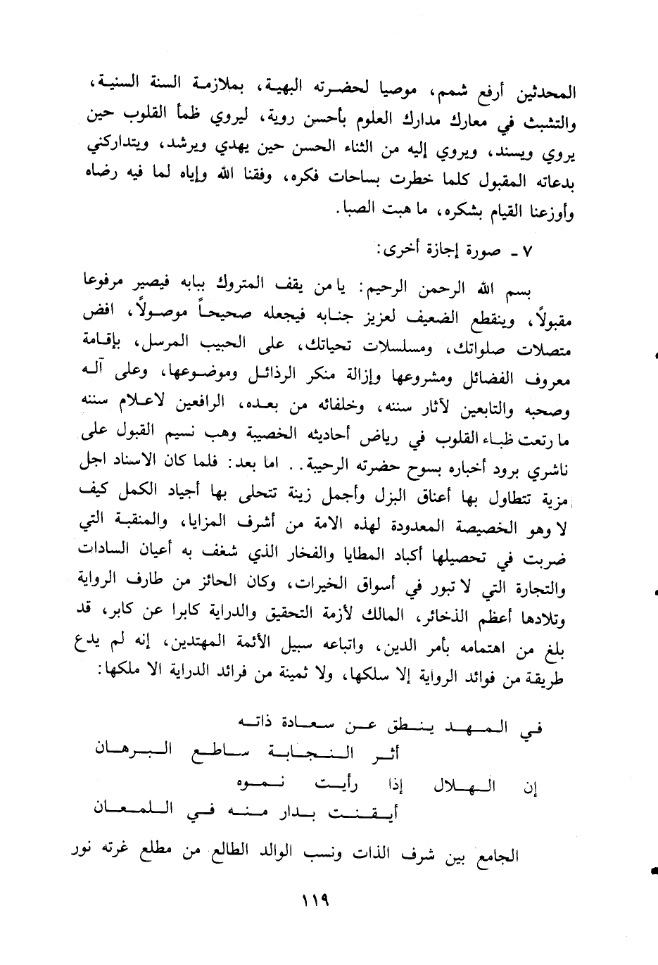 المحدثين أرفع شمم، موصيا لحضرته البهية، بملازمة السنة السنية، والتشبث في معارك مدارك العلوم بأحسن روية، ليروي ظمأ القلوب حين يروي ويسند، ويروي إليه من الثناء الحسن حين يهدي ويرشد، ويتداركني بدعاته المقبول كلما خطرت بساحات فكره، وفقنا اللّه وإياه لما فيه رضاه وأوزعنا القيام بشكره، ما هبت الصبا.