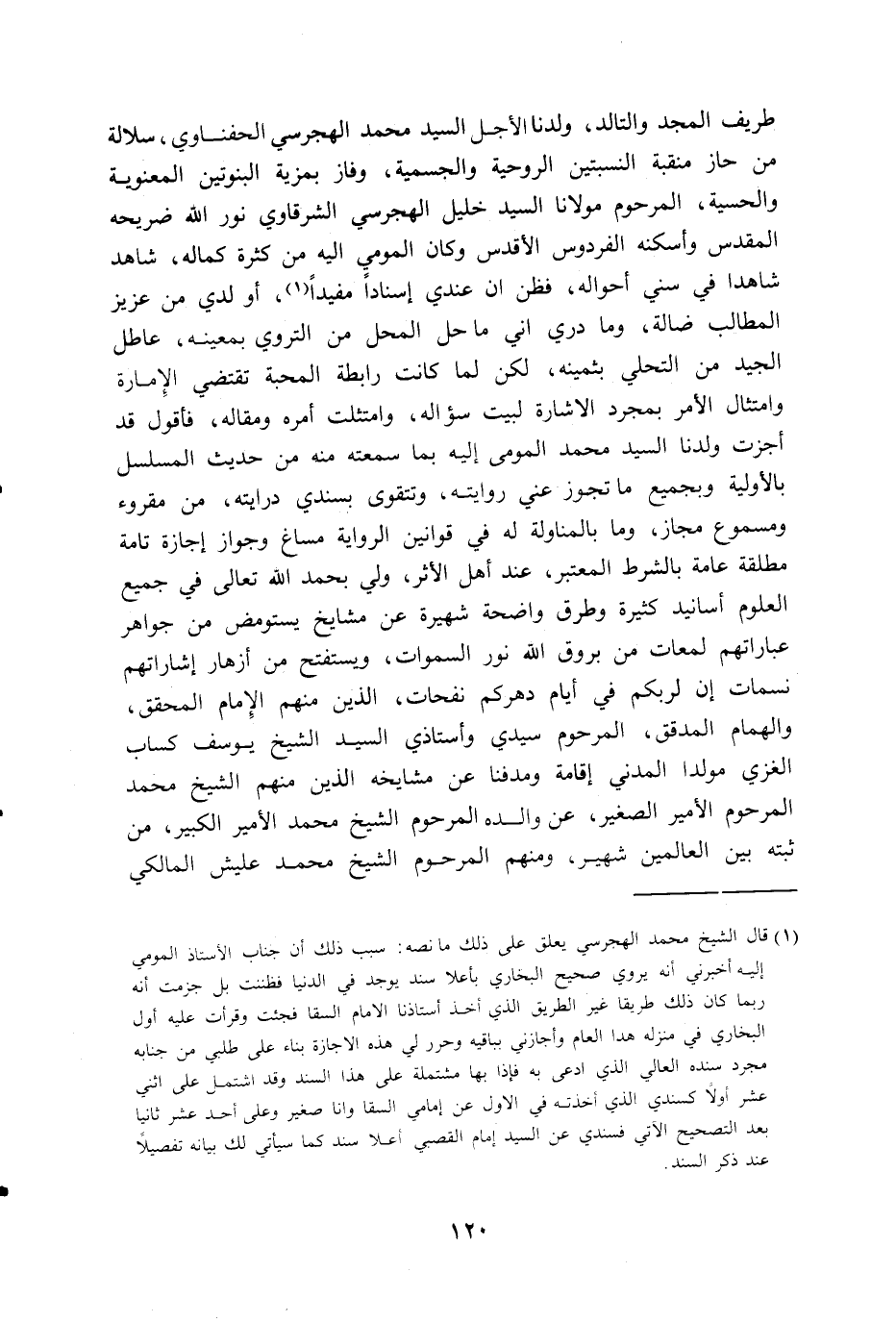 طريف المجد والتالد، ولدنا الأجل السيد محمد الهجرسي الحفناوي، سلالة من حاز منقبة النسبتين الروحية والجسمية، وفاز بمزية البنوتين المعنوية والحسية، المرحوم مولانا السيد خليل الهجرسي الشرقاوي نور اللّه ضريحه المقدس وأسكنه الفردوس الأقدس وكان المومي اليه من كثرة كماله، شاهد شاهدا في سني أحواله، فظن ان عندي إسنادا مفيدا 1، أو لدي من عزيز المطالب ضالة، وما دري اني ما حل المحل من التروي بمعينه، عاطل الجيد من التحلي بثمينه، لكن لما كانت رابطة المحبة تقتضي الإمارة وامتثال الأمر بمجرد الاشارة لبيت سؤاله، وامتثلت أمره ومقاله، فأقول قد أجزت ولدنا السيد محمد المومى إليه بما سمعته منه من حديث المسلسل بالأولية وبجميع ما تجوز عني روايته، وتتقوى بسندي درايته، من مقروء ومسموع مجاز، وما بالمناولة له في قوانين الرواية مساغ وجواز إجازة تامة مطلقة عامة بالشرط المعتبر، عند أهل الأثر، ولي بحمد اللّه تعالى في جميع العلوم أسانيد كثيرة وطرق واضحة شهيرة عن مشايخ يستومض من جواهر عباراتهم لمعات من بروق اللّه نور السموات، ويستفتح من أزهار إشاراتهم نسمات إن لربكم في أيام دهركم نفحات، الذين منهم الإمام المحقق، والهمام المدقق، المرحوم سيدي وأستاذي السيد الشيخ يوسف كساب الغزي مولدا المدني إقامة ومدفنا عن مشايخه الذين منهم الشيخ محمد المرحوم الأمير الصغير، عن والده المرحوم الشيخ محمد الأمير الكبير، من ثبته بين العالمين شهير، ومنهم المرحوم الشيخ محمد عليش المالكي