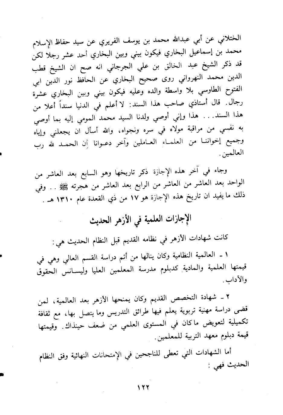 الختلاني عن أبي عبد اللّه محمد بن يوسف الفريري عن سيد حفاظ الإسلام محمد بن إسماعيل البخاري فيكون بيني وبين البخاري أحد عشر رجلا لكن قد ذكر الشيخ عبد الخالق بن علي الجرجاني انه صح ان الشيخ قطب الدين محمد النهرواني روى صحيح البخاري عن الحافظ نور الدين ابي الفتوح الطاوسي بلا واسطة والده وعليه فيكون بيني وبين البخاري عشرة رجال. قال أستاذي صاحب هذا السند: لا أعلم في الدنيا سندا أعلا من هذا السند. . . هذا وإني أوصي ولدنا السيد محمد المومي إليه بما أوصي به نفسي من مراقبة مولاه في سره ونجواه، واللّه أسأل ان يجعلني وإياه وجميع إخواننا من العلماء العاملين وآخر دعوانا أن الحمد للّه رب العالمين.