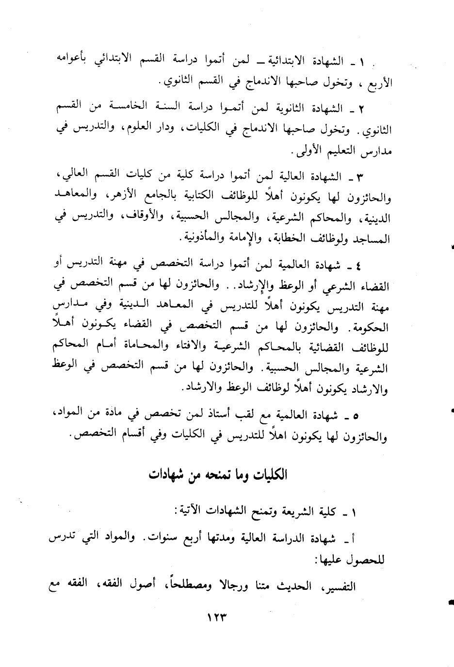 4 - شهادة العالمية لمن أتموا دراسة التخصص في مهنة التدريس أو القضاء الشرعي أو الوعظ والإرشاد. . والحائزون لها من قسم التخصص في مهنة التدريس يكونون أهلا للتدريس في المعاهد الدينية وفي مدارس الحكومة. والحائزون لها من قسم التخصص في القضاء يكونون أهلا للوظائف القضائية بالمحاكم الشرعية والافتاء والمحاماة أمام المحاكم الشرعية والمجالس الحسبية. والحائزون لها من قسم التخصص في الوعظ والارشاد يكونون أهلا لوظائف الوعظ والارشاد.