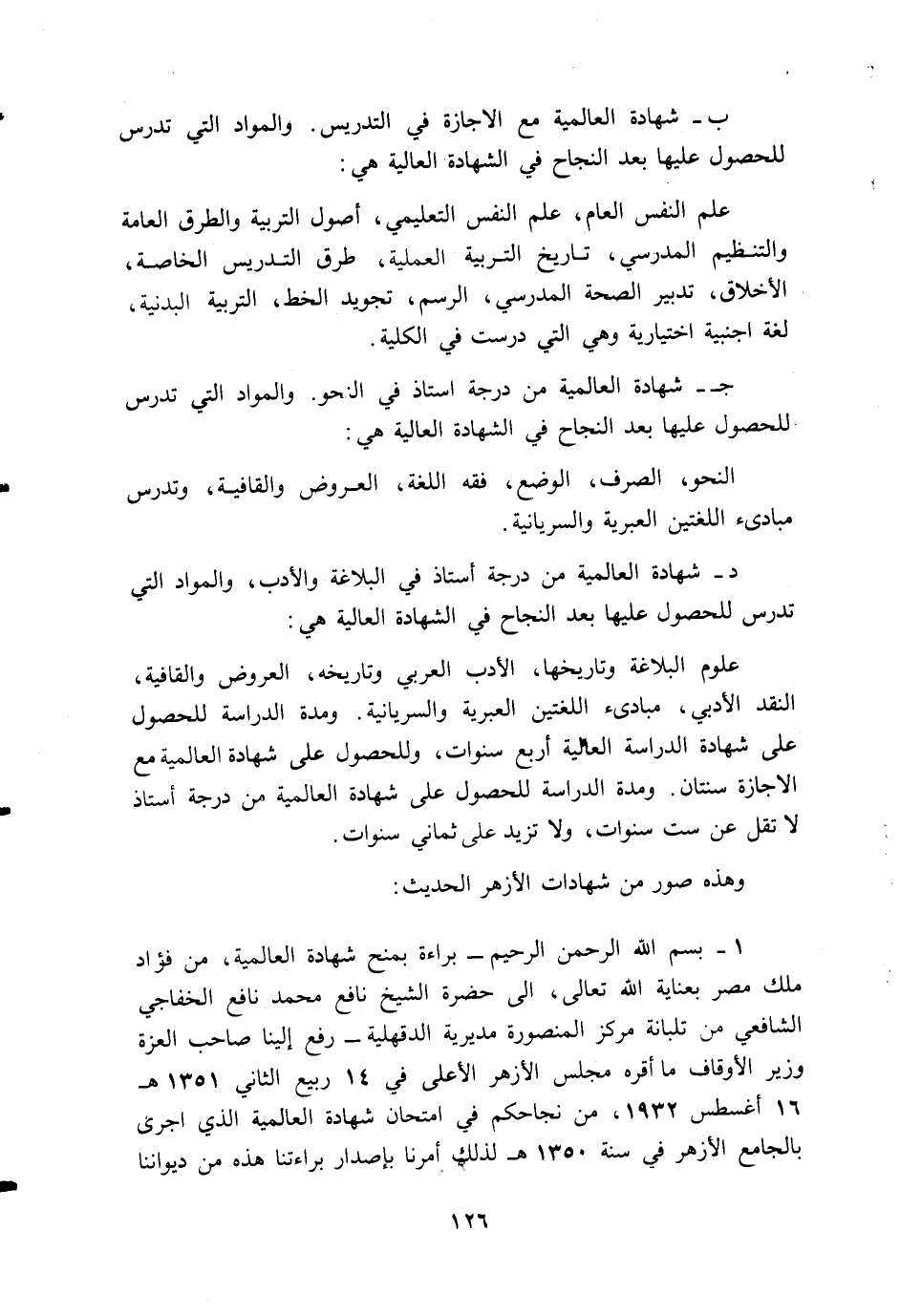 د-شهادة العالمية من درجة أستاذ في البلاغة والأدب، والمواد التي تدرس للحصول عليها بعد النجاح في الشهادة العالية هي: