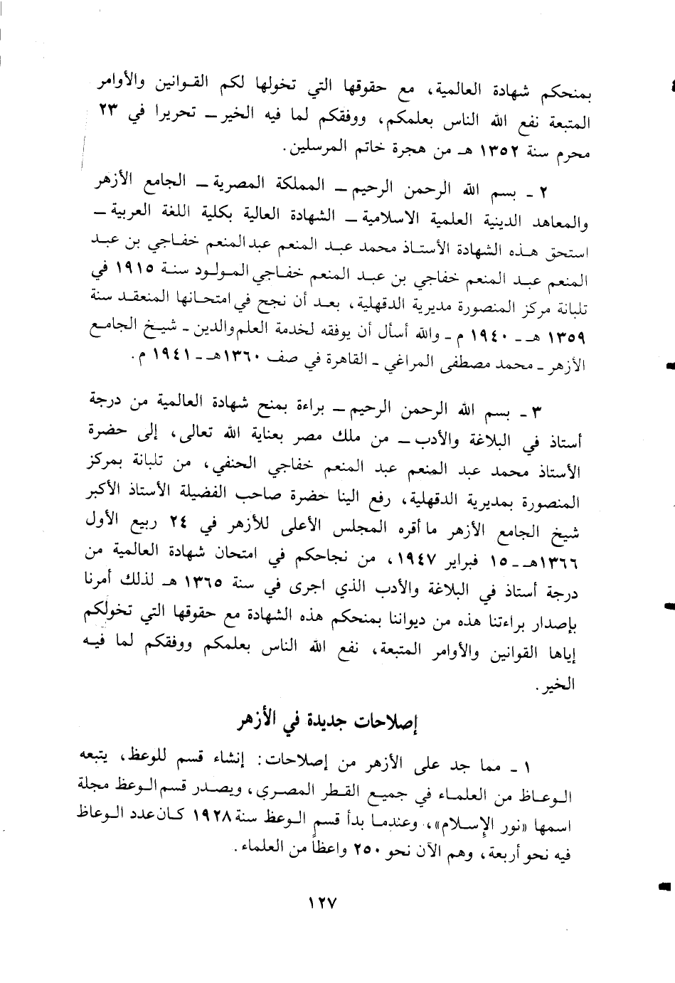 3 - بسم اللّه الرحمن الرحيم-براءة بمنح شهادة العالمية من درجة أستاذ في البلاغة والأدب-من ملك مصر بعناية اللّه تعالى، إلى حضرة الأستاذ محمد عبد المنعم عبد المنعم خفاجي الحنفي، من تلبانة بمركز المنصورة بمديرية الدقهلية، رفع الينا حضرة صاحب الفضيلة الأستاذ الأكبر شيخ الجامع الأزهر ما أقره المجلس الأعلى للأزهر في 24 ربيع الأول 1366 ه- 15 فبراير 1947، من نجاحكم في امتحان شهادة العالمية من درجة أستاذ في البلاغة والأدب الذي اجرى في سنة 1365 ه لذلك أمرنا بإصدار براءتنا هذه من ديواننا بمنحكم هذه الشهادة مع حقوقها التي تخولكم إياها القوانين والأوامر المتبعة، نفع اللّه الناس بعلمكم ووفقكم لما فيه الخير.