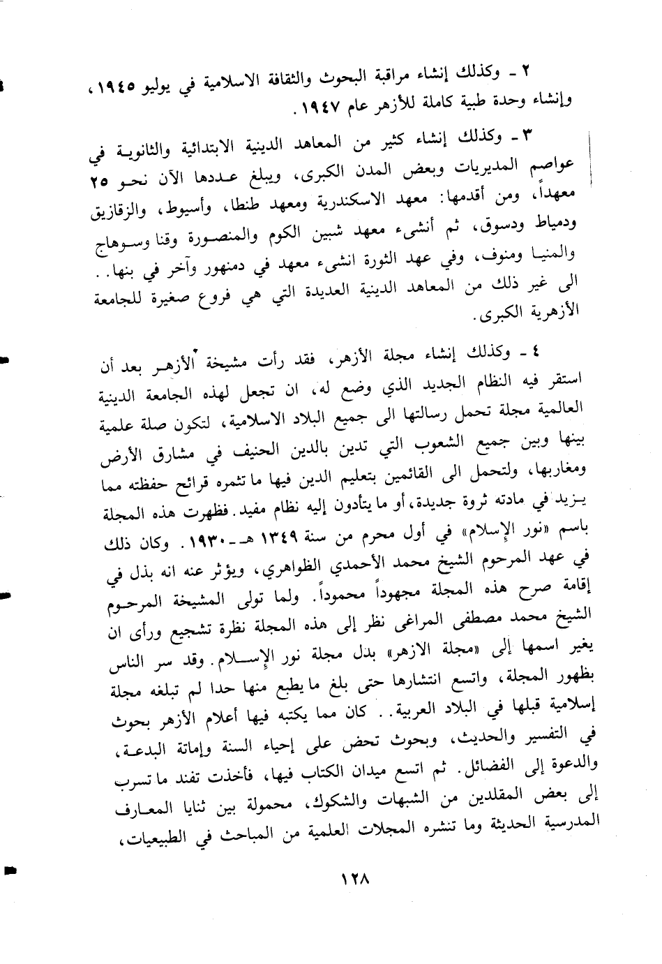 2 - وكذلك إنشاء مراقبة البحوث والثقافة الاسلامية في يوليو 1945، وإنشاء وحدة طبية كاملة للأزهر عام 1947.