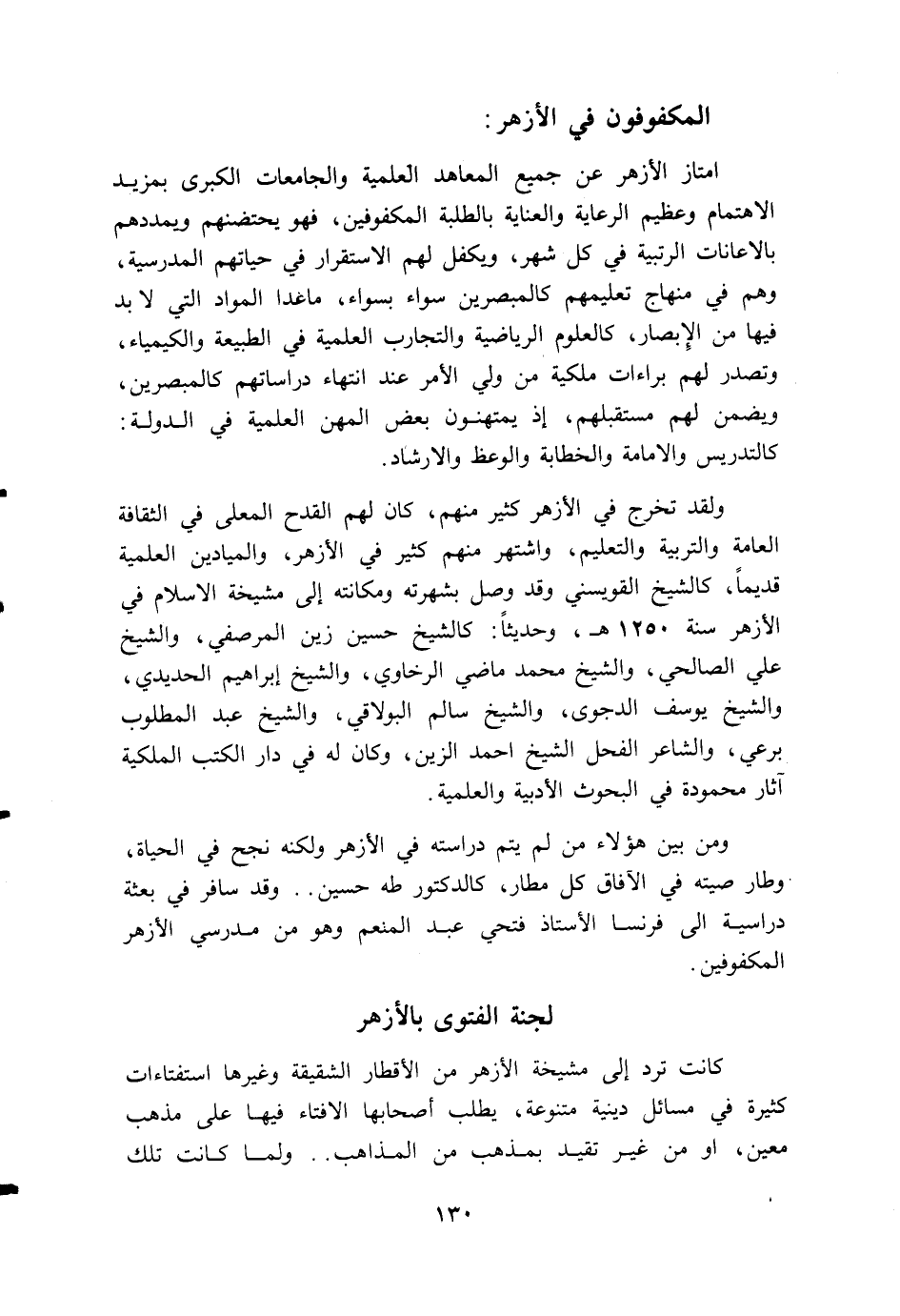 امتاز الأزهر عن جميع المعاهد العلمية والجامعات الكبرى بمزيد الاهتمام وعظيم الرعاية والعناية بالطلبة المكفوفين، فهو يحتضنهم ويمددهم بالاعانات الرتبية في كل شهر، ويكفل لهم الاستقرار في حياتهم المدرسية، وهم في منهاج تعليمهم كالمبصرين سواء بسواء، ما عدا المواد التي لا بد فيها من الإبصار، كالعلوم الرياضية والتجارب العلمية في الطبيعة والكيمياء، وتصدر لهم براءات ملكية من ولي الأمر عند انتهاء دراساتهم كالمبصرين، ويضمن لهم مستقبلهم، إذ يمتهنون بعض المهن العلمية في الدولة: