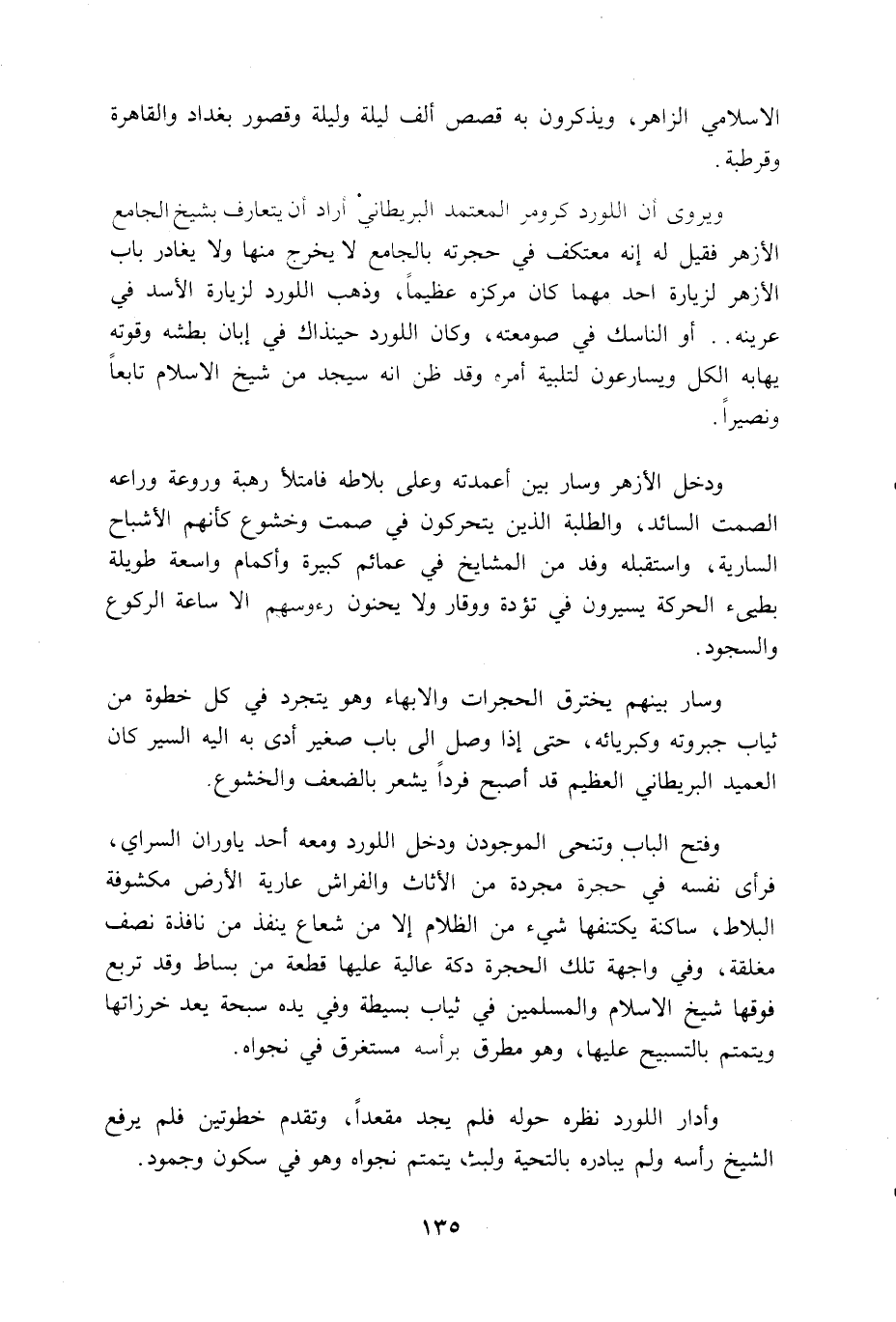 وسار بينهم يخترق الحجرات والابهاء وهو يتجرد في كل خطوة من ثياب جبروته وكبريائه، حتى إذا وصل الى باب صغير أدى به اليه السير كان العميد البريطاني العظيم قد أصبح فردا يشعر بالضعف والخشوع.