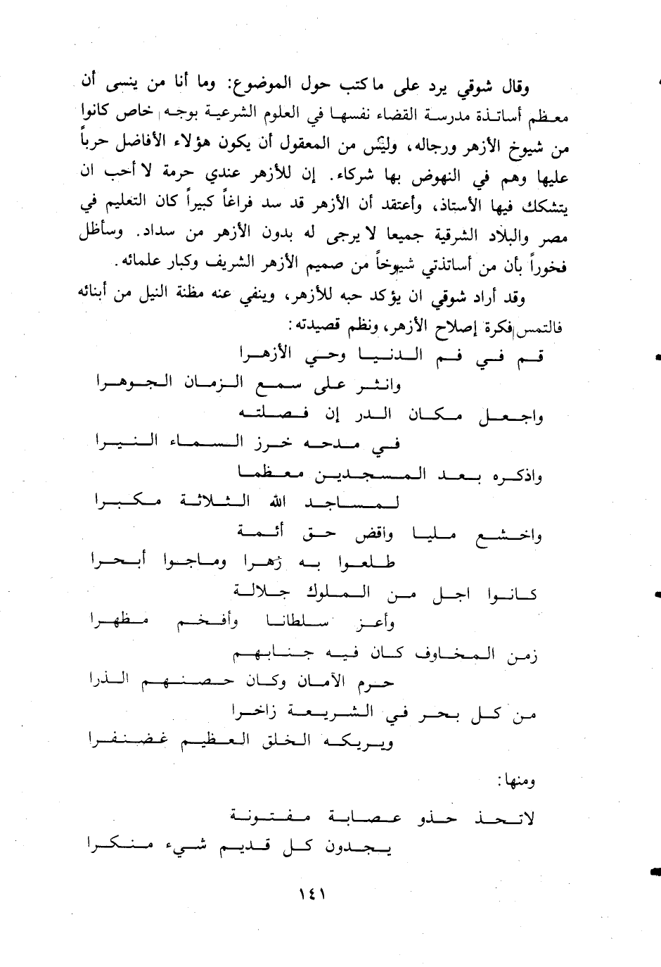 وقد أراد شوقي ان يؤكد حبه للأزهر، وينفي عنه مظنة النيل من أبنائه فالتمس فكرة إصلاح الأزهر، ونظم قصيدته: