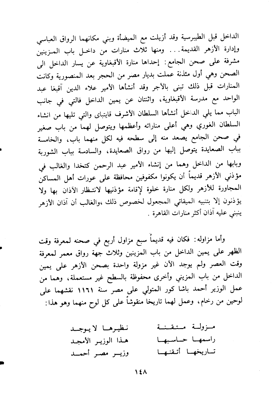 الداخل قبل الطيبرسية وقد أزيلت مع الميضأة وبني مكانهما الرواق العباسي وإدارة الأزهر القديمة. . . ومنها ثلاث منارات من داخل باب المزينين مشرفة على صحن الجامع: إحداها منارة الأقبغاوية عن يسار الداخل الى الصحن وهي أول مئذنة عملت بديار مصر من الحجر بعد المنصورية وكانت المنارات قبل ذلك تبنى بالآجر وقد أنشأها الأمير علاء الدين آقبغا عبد الواحد مع مدرسة الأقبغاوية، واثنتان عن يمين الداخل فالتي في جانب الباب مما يلي الداخل أنشأها السلطان الأشرف قايتباى والتي تليها من انشاء السلطان الغوري وهي أعلى مناراته وأعظمها ويتوصل لهما من باب صغير في صحن الجامع يصعد منه إلى سطحه فيه لكل منهما باب، والخامسة بباب الصعايدة يتوصل إليها من رواق الصعايدة، والسادسة بباب الشوربة وبابها من الداخل وهما من إنشاء الأمير عبد الرحمن كتخدا والغالب في مؤذني الأزهر قديما أن يكونوا مكفوفين محافظة على عورات أهل المساكن المجاورة للأزهر ولكل منارة خلوة لإقامة مؤذنيها لانتظار الآذان بها ولا يؤذنون إلا بتنبيه الميقاتي المجعول لخصوص ذلك، والغالب أن آذان الأزهر ينبني عليه آذان أكثر منارات القاهرة.