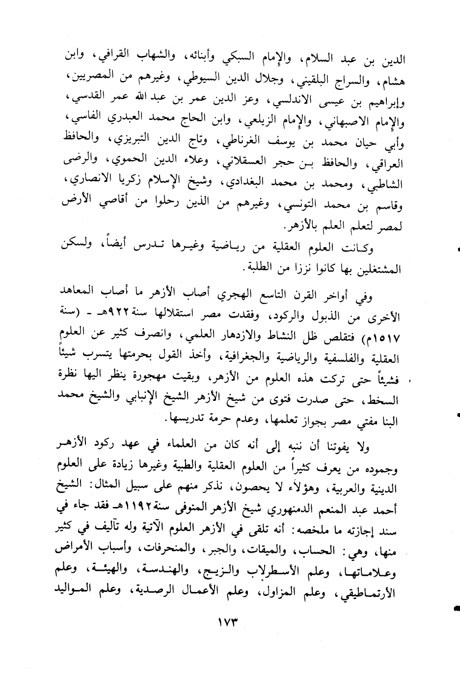 ولا يفوتنا أن ننبه إلى أنه كان من العلماء في عهد ركود الأزهر وجموده من يعرف كثيرا من العلوم العقلية والطبية وغيرها زيادة على العلوم الدينية والعربية، وهؤلاء لا يحصون، نذكر منهم على سبيل المثال: الشيخ أحمد عبد المنعم الدمنهوري شيخ الأزهر المتوفى سنة 1192 ه فقد جاء في سند إجازته ما ملخصه: أنه تلقى في الأزهر العلوم الآتية وله تآليف في كثير منها، وهي: الحساب، والميقات، والجبر، والمنحرفات، وأسباب الأمراض وعلاماتها، وعلم الأسطرلاب والزيج، والهندسة، والهيئة، وعلم الأرتماطيقي، وعلم المزاول، وعلم الأعمال الرصدية، وعلم المواليد