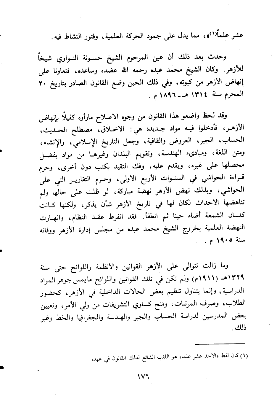وحدث بعد ذلك أن عين المرحوم الشيخ حسونة النواوي شيخا للأزهر. وكان الشيخ محمد عبده رحمه اللّه عضده وساعده، فتعاونا على إنهاض الأزهر من كبوته، وفي ذلك الحين وضع القانون الصادر بتاريخ 20 المحرم سنة 1314 ه- 1896 م.