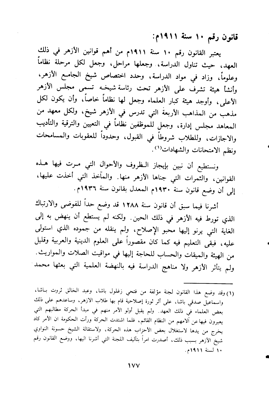 1) وقد وضع هذا القانون لجنة مؤلفة من فتحي زغلول باشا، وعبد الخالق ثروت باشا، واسماعيل صدقي باشا، على أثر ثورة إصلاحية قام بها طلاب الأزهر، وساعدهم على ذلك بعض العلماء في ذلك العهد. ولم يقبل أولو الأمر منهم في مبدأ الحركة مطالبهم التي يعبرون فيها عن آلامهم من النظام القائم، فلما اشتدت الحركة ورأت الحكومة ان الأمر كاد يخرج من يدها لاستغلال بعض الأحزاب هذه الحركة، ولاستقالة الشيخ حسونة النواوي شيخ الأزهر بسبب ذلك، أصدرت امرا بتأليف اللجنة التي أشرنا اليها، ووضع القانون رقم 10 لسنة 1911 م.