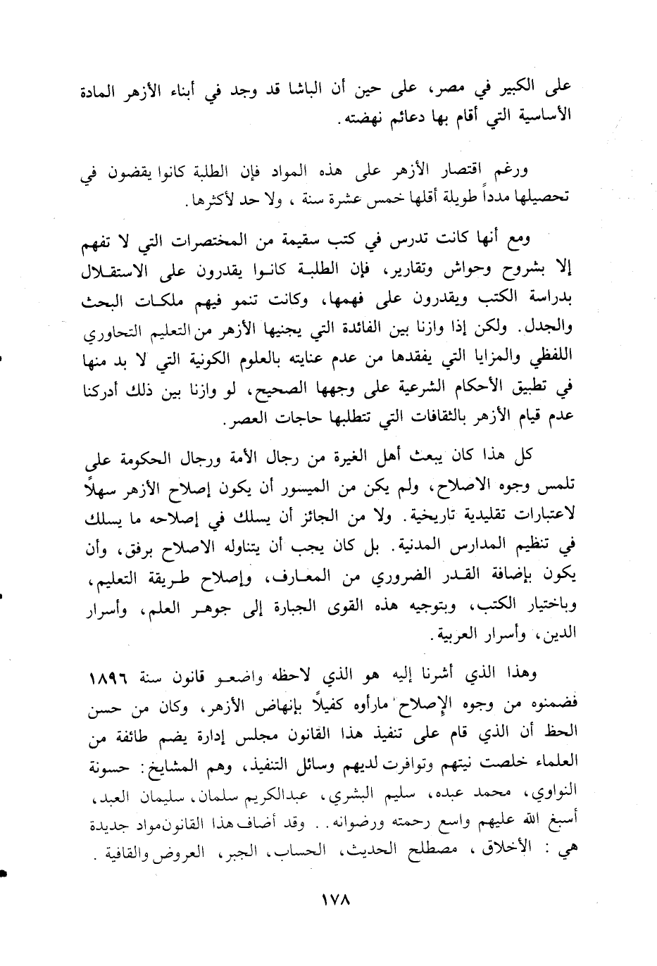 كل هذا كان يبعث أهل الغيرة من رجال الأمة ورجال الحكومة على تلمس وجوه الاصلاح، ولم يكن من الميسور أن يكون إصلاح الأزهر سهلا لاعتبارات تقليدية تاريخية. ولا من الجائز أن يسلك في إصلاحه ما يسلك في تنظيم المدارس المدنية. بل كان يجب أن يتناوله الاصلاح برفق، وأن يكون بإضافة القدر الضروري من المعارف، وإصلاح طريقة التعليم، وباختيار الكتب، وبتوجيه هذه القوى الجبارة إلى جوهر العلم، وأسرار الدين، وأسرار العربية.